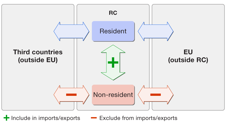 In the process of compilation of the trade in goods statistics of the balance of payments of the RC, the CNB will continue to adjust data on imports and exports from the trade in goods statistics of the RC by excluding cross-border transactions which do not involve a change in ownership between residents and non-residents and including trade in goods between residents and non-residents taking place in the territory of the RC. The necessity of this adjustment arises also from a recommendation issued by the European Commission (Eurostat) Foreign trade reported by non-residents, as shown in Figure 1.