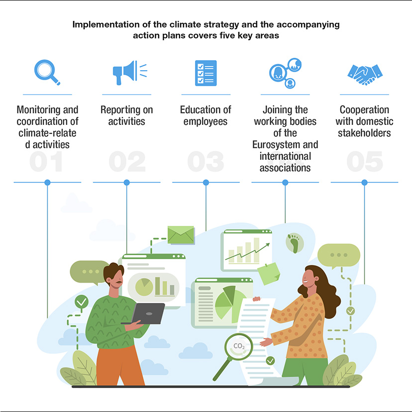 By defining the “commitment to sustainable development” as one of the CNB’s strategic objectives and by adopting the Climate Strategy, the consideration of climate change has been integrated in all areas of CNB’s activity. Intensified coordination of climate-related activities and a further strengthening of cooperation with stakeholders at the national, European and global levels will contribute to the reinforcement and the necessary interconnectedness of the planned activities at the CNB.