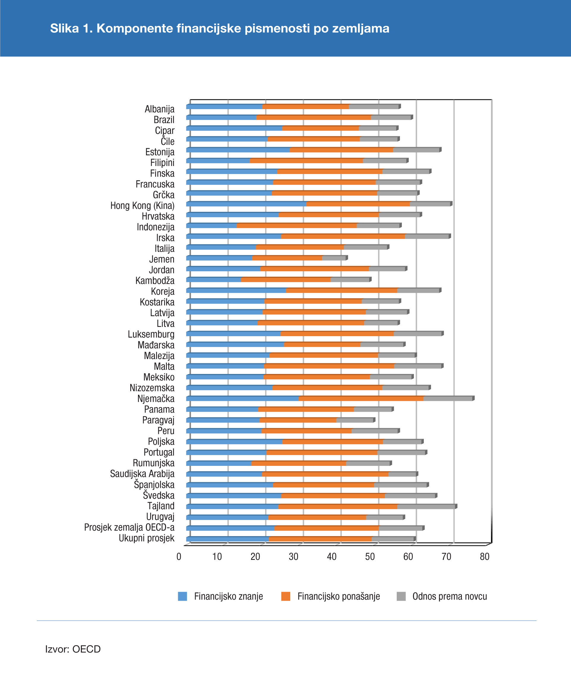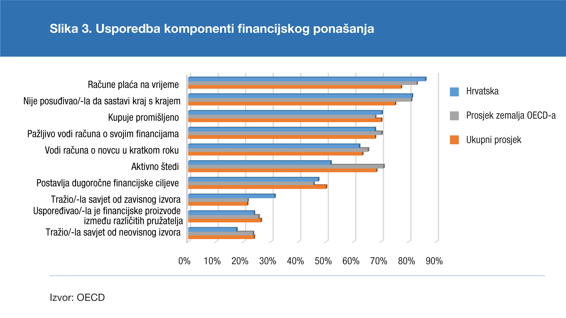 Hrvatska je najbolje rezultate ostvarila u kategoriji financijskog znanja (70%), što je za 3 postotna boda bolje od prosjeka zemalja OECD-a (67%).