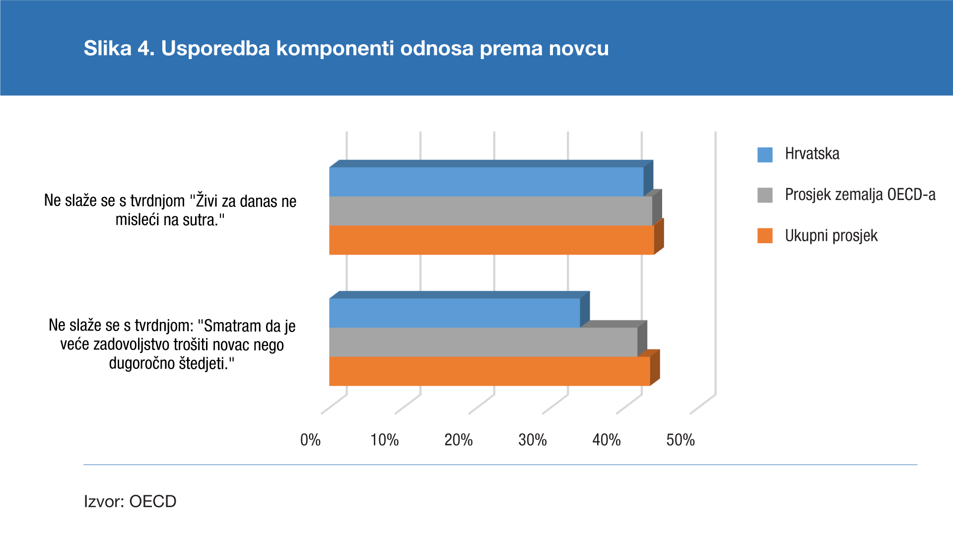 Odnos prema novcu pokazuje kako i nadalje značajan dio građana u Hrvatskoj prednost daje potrošnji pred dugoročnom štednjom (Slika 4.). Ujedno je to jedina komponenta financijske pismenosti u okviru koje su postignuti rezultati na svim pitanjima niži od prosjeka zemalja koje su sudjelovale u istraživanju i prosjeka zemalja OECD-a.