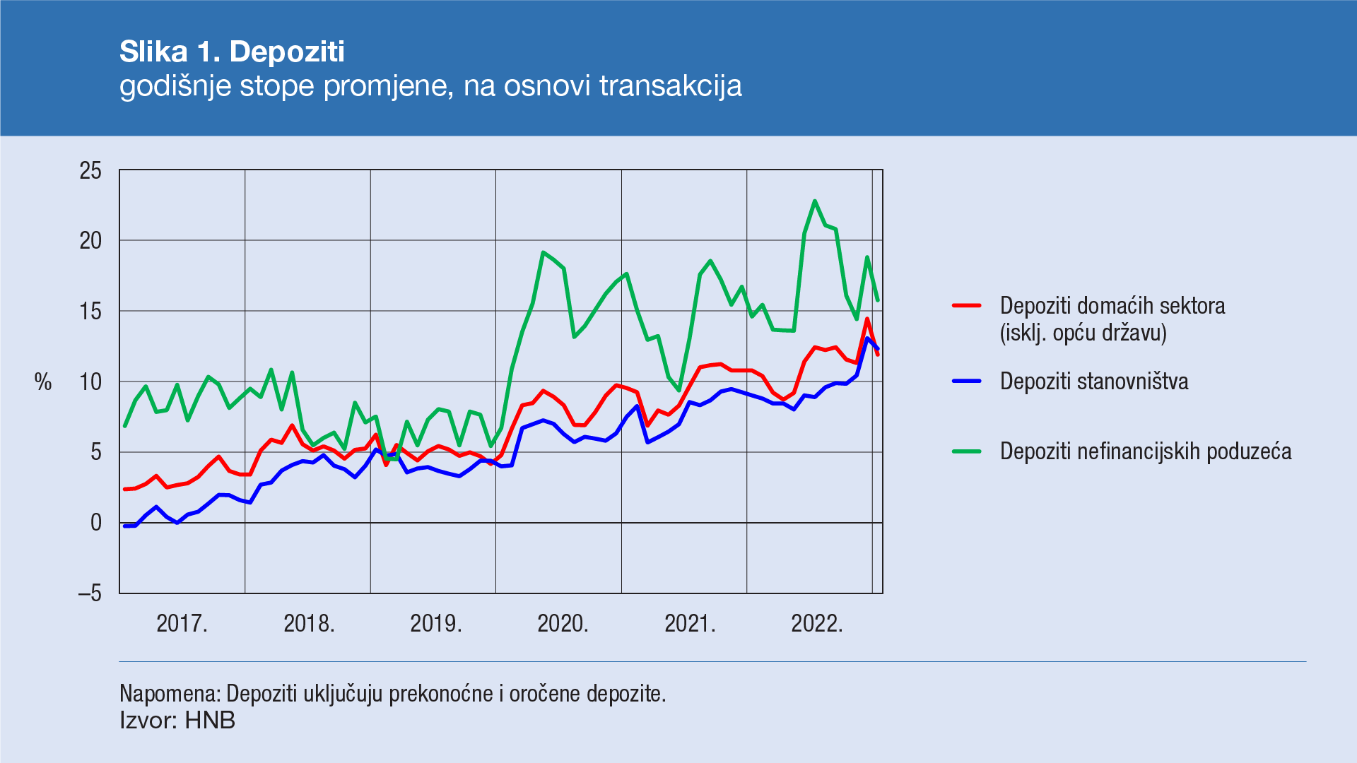 Ukupni depoziti domaćih sektora smanjili su se u siječnju 2023. za 1,2 mlrd. EUR ili 2,2% (na osnovi transakcija), odražavajući smanjenje prekonoćnih depozita (1,6 mlrd. EUR), dok su se oročeni depoziti povećali. Oko tri četvrtine smanjenja prekonoćnih depozita odnosi se na poduzeća, koja su prebacivala sredstva na oročene depozite, kao i osiguravajuća društva i mirovinski fondovi. Prekonoćni depoziti stanovništva prestali su rasti prvi put od 2016. godine, ali ne zbog prebacivanja sredstava na oročene depozite, koji su tek blago porasli. Nastavak trenda rasta prosječne kamatne stope na oročene depozite domaćih sektora, posebice poduzeća, potiče prelijevanje dijela prekonoćnih depozita na oročene. Promatra li se na godišnjoj razini, rast ukupnih depozita poduzeća usporio se s 18,8% u prosincu na 15,8% u siječnju (na osnovi transakcija), a depozita stanovništva s 13,1% na 12,3% (Slika 1.).
