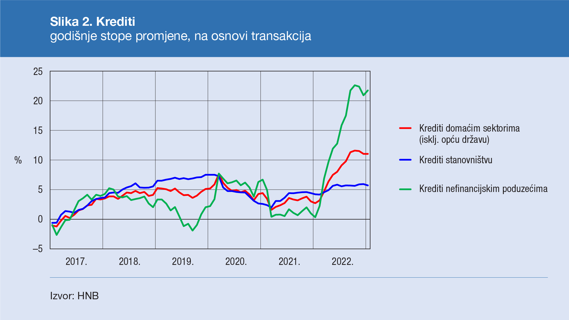 Kreditiranje domaćih sektora blago je poraslo u siječnju 2023. (za 56 mil. EUR ili 0,2%, na osnovi transakcija). Pritom su krediti nefinancijskim poduzećima nastavili rasti (101 mil. EUR ili 0,7%), uglavnom zbog zaduživanja poduzeća iz energetskog sektora, dok je za kredite stanovništvu i ostalim financijskim institucijama zabilježeno smanjenje. U strukturi kredita stanovništvu stambeni su krediti ostali gotovo nepromijenjeni, što može biti povezano sa znatnijim porastom stambenoga kreditiranja u prosincu u očekivanju pooštravanja uvjeta kreditiranja. Promatrano na godišnjoj razini, rast kredita nefinancijskim poduzećima ubrzao se s 20,9% u prosincu na 21,8% u siječnju, dok se u istom razdoblju kod stanovništva usporio s 5,9% na 5,7% (Slika 2.). Pritom se rast stambenih kredita usporio s 10,4% u prosincu na 10,0% u siječnju, a gotovinskih nenamjenskih s 3,5% na oko 3%.