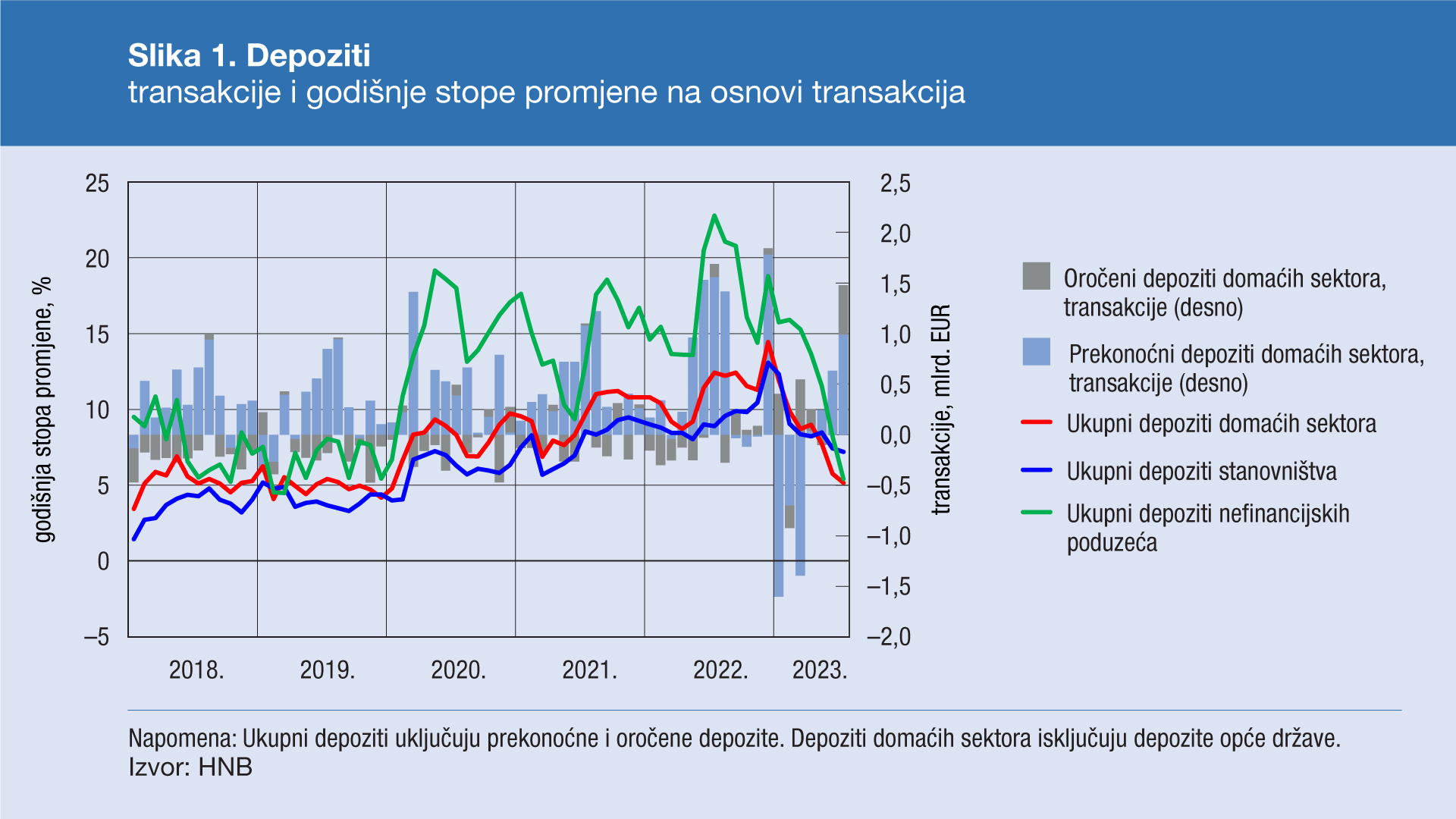 Očekivani dobri financijski rezultati glavnog dijela turističke sezone potaknuli su u srpnju snažan sezonski rast ukupnih domaćih depozita, ponajprije kućanstava i poduzeća. Ipak, na godišnjoj se razini njihov rast usporio, što se uglavnom može povezati sa specifičnim činiteljima koji su povećali depozite u drugoj polovini protekle godine. Ukupni depoziti tako su u srpnju porasli za 1,5 mlrd. EUR (ili 2,8%, na osnovi transakcija). Pritom su prekonoćni depoziti porasli za 1,0 mlrd. EUR, a oročeni depoziti za 0,5 mlrd. EUR. Promatrano sektorski, najviše su porasli prekonoćni depoziti kućanstava (0,5 mlrd. EUR), zatim nefinancijskih poduzeća (0,4 mlrd. EUR), a slabije su rasli i prekonoćni depoziti ostalih financijskih institucija (0,1 mlrd. EUR). Rastu oročenih depozita najviše su pridonijeli sektor nefinancijskih poduzeća (0,3 mlrd. EUR) i, nešto manje izraženo, ostale financijske institucije (0,1 mlrd. EUR), dok su oročeni depoziti kućanstava tek blago porasli. Na godišnjoj su razini ukupni domaći depoziti ipak usporili rast (s 5,8% u lipnju na 5,2% u srpnju, na osnovi transakcija) zbog učinka baznog razdoblja, odnosno izraženijeg rasta u istom mjesecu prethodne godine. Naime, sredinom prošle godine zabilježeno je znatno zaduživanje poduzeća nakon rasta cijena sirovina i energenata, kao i jačanje priljeva gotovine u banke uoči uvođenja eura. Promatrano sektorski, depoziti nefinancijskih poduzeća i stanovništva usporili su rast na godišnjoj razini s 8,2% u lipnju na 5,4% u srpnju, odnosno sa 7,4% u lipnju na 7,2% u srpnju (Slika 1).