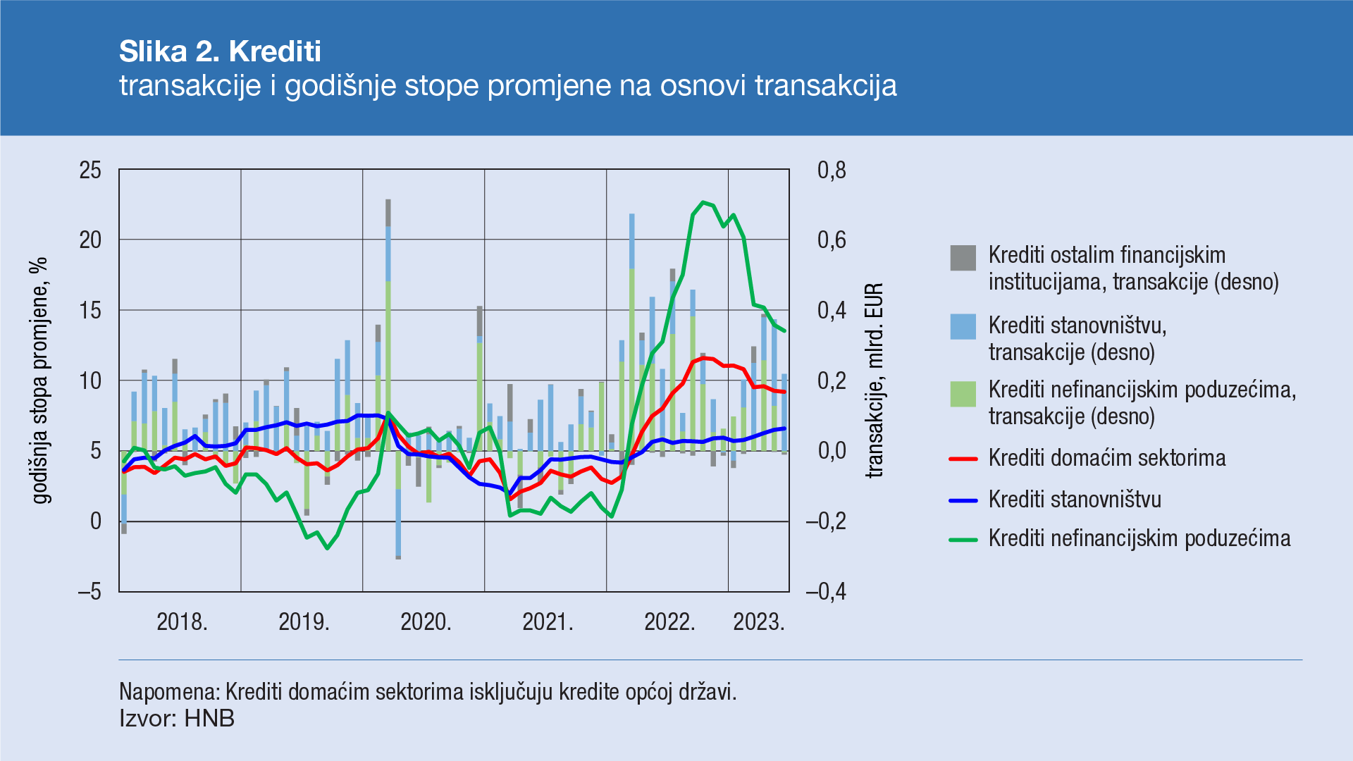 Ukupni krediti nastavili su rasti i u srpnju (za 246 mil. EUR ili 0,7%) razmjerno snažnim intenzitetom, kao i proteklih mjeseci. Pritom su stambeni krediti zabilježili najsnažniji rast u proteklih godinu dana (158 mil. EUR) odražavajući novi krug dodjele državnih subvencija za stambene kredite, a snažno su porasli i gotovinski nenamjenski krediti (67 mil. EUR). U segmentu kredita nefinancijskim poduzećima, porasli su krediti za investicije[2] i u manjoj mjeri krediti za obrtna sredstva. No, istodobno su se smanjili krediti za turizam, faktoring i udjeli u sindiciranim kreditima, što je prigušilo ukupan porast kredita (27 mil. EUR) poduzećima. Na godišnjoj se razini rast kredita stanovništvu nastavio ubrzavati, sa 6,6% u lipnju na 6,9% u srpnju (na osnovi transakcija), pri čemu se nastavilo ubrzavanje rasta i gotovinskih nenamjenskih kredita (sa 6,3% na 6,8%) i stambenih kredita (s 9,2% na 9,5%). Krediti poduzećima u srpnju su usporili godišnji rast (s 13,5% na 10,8%), što je dovelo do usporavanja rasta ukupnih kredita s 9,2% na 8,2% (Slika 2.).