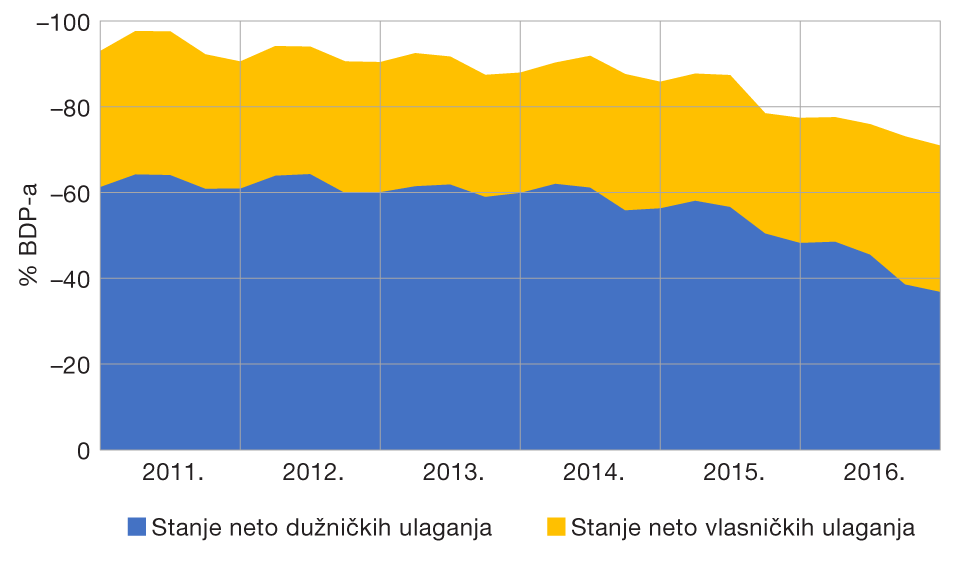 Iako su opisane transakcije na financijskom računu platne bilance djelovale u smjeru rasta ukupnih neto obveza, stanje neto međunarodnih ulaganja poboljšalo se u posljednjem tromjesečju 2016. za 0,6 mlrd. EUR, zahvaljujući vrijednosnom usklađivanju imovine i obveza (tečajne, cjenovne i druge prilagodbe koje nisu obuhvaćene statistikom platne bilance). Na kraju se godine stanje neto međunarodnih ulaganja smanjilo na –32,3 mlrd. EUR, čime se nastavio višegodišnji trend smanjivanja vanjskih neravnoteža.