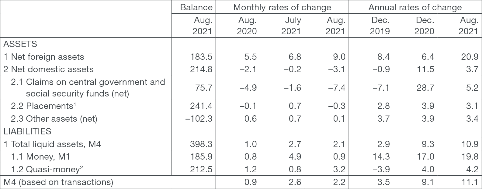 Total liquid assets (M4) continued to increase in August, mostly due to a strong inflow of foreign currency from tourism during the peak tourist season.