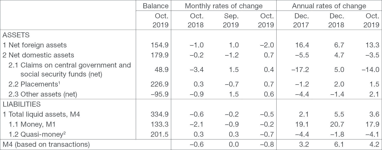 Total liquid assets (M4) stood at HRK 334.9bn at the end of October 2019, down 0.8% from the previous month (based on transactions, Table 1). If analysed on an annual basis, the growth in total liquid assets (M4) slowed down to 4.2% in October 2019 (Figure 1). The annual fall of quasi-money deepened to –2.6% (based on transactions) at the end of the month, while the annual growth of money (M1) accelerated to 17.0%, mostly due to the acceleration in the growth of demand deposits.