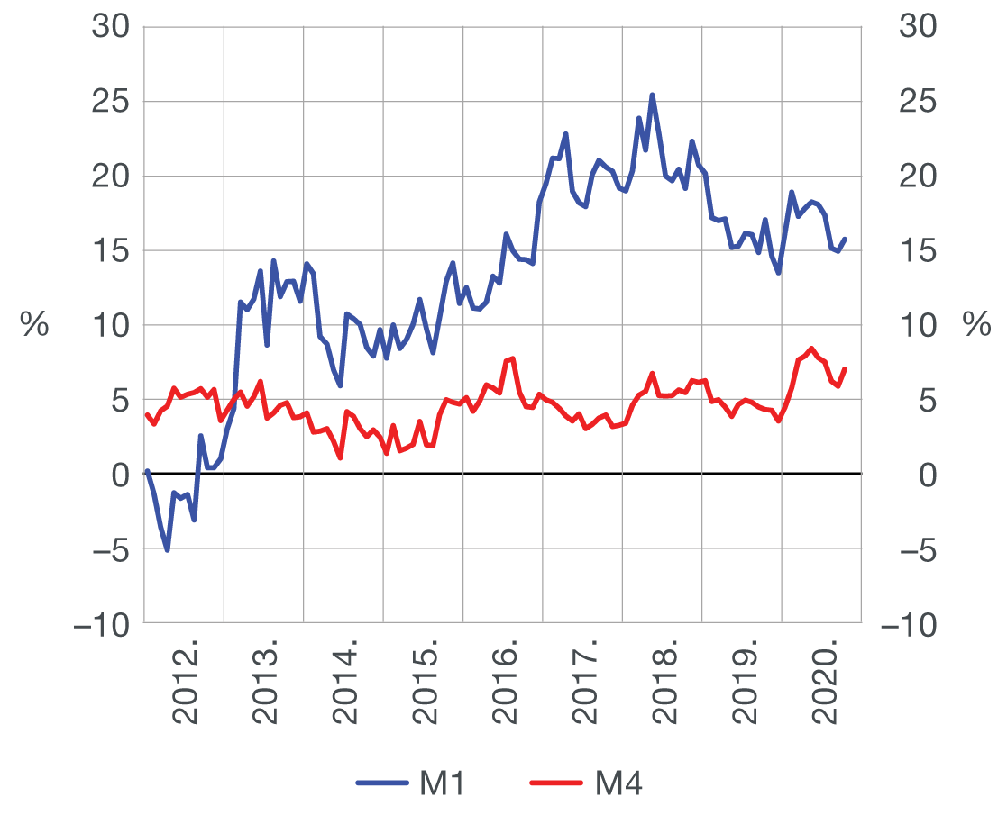 Povećanje neto domaće aktive monetarnih institucija tijekom listopada 2020. povećalo je ukupna likvidna sredstva (M4) i uz smanjenje neto inozemne aktive. Ujedno se blago ubrzao i godišnji rast M4.