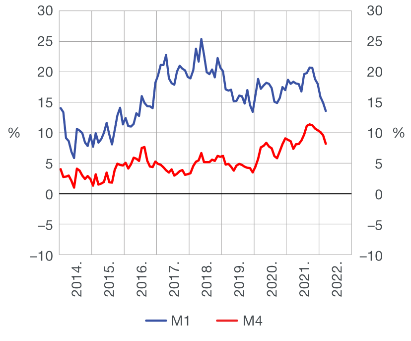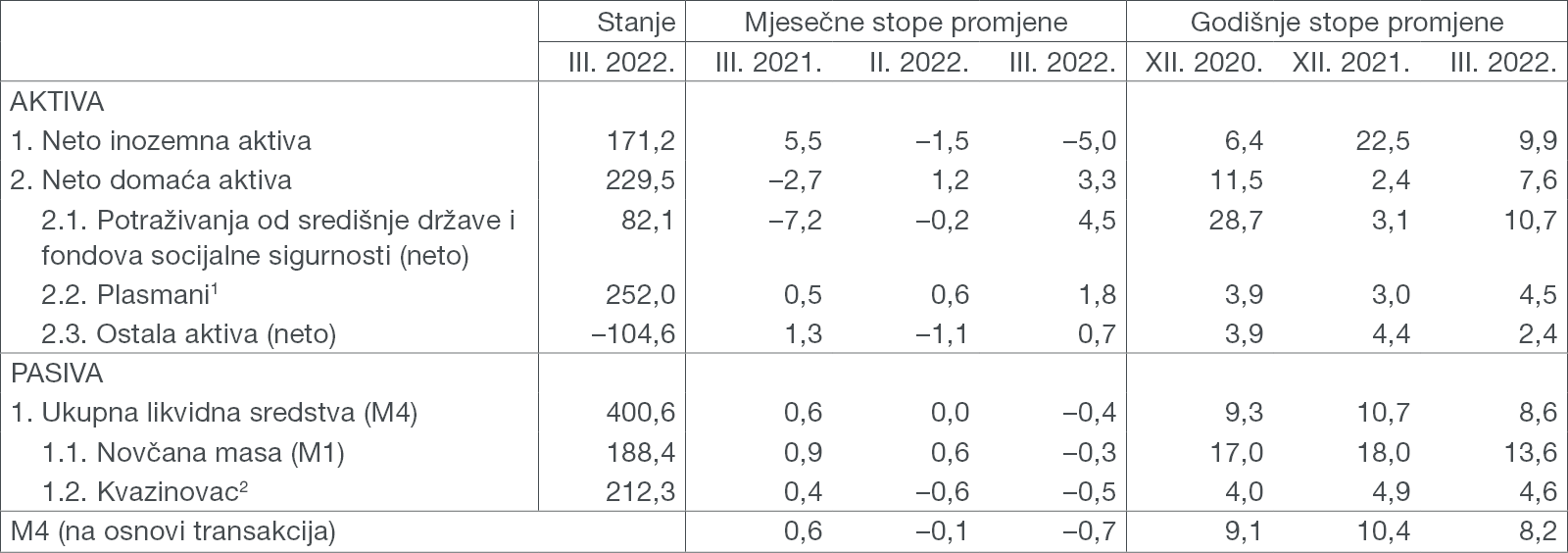 Ukupna likvidna sredstva (M4[1]) smanjila su se u ožujku za 2,7 mlrd. kuna ili 0,7% (na osnovi transakcija, Tablica 1.) kao rezultat snažnog pada neto inozemne aktive (NIA) monetarnog sustava, a istodobno je neto domaća aktiva (NDA) porasla. Rast NDA-a odraz je rasta plasmana domaćim sektorima i rasta neto potraživanja od središnje države koji je u prvom redu zabilježen zbog smanjenja depozita države kod HNB-a. Novčana masa (M1[2]) smanjila se na mjesečnoj razini za 0,6 mlrd. kuna (0,3%) ponajprije zbog smanjenja depozitnog novca nefinancijskih poduzeća. Kvazinovac u ožujku bilježi izraženiji mjesečni pad (2,1 mlrd. kuna ili 1,0%), čemu je ponajviše pridonijelo smanjenje deviznih depozita stanovništva, a u manjoj mjeri i deviznih depozita ostalih domaćih sektora (Tablica 3.). Na monetarna kretanja u ožujku utjecala je vojna agresija Rusije na Ukrajinu, koja je u prvoj polovini mjeseca rezultirala padom NIA-e monetarnog sustava povezanim s povlačenjem depozita stanovništva. Slijedom navedenog nastavilo se usporavanje godišnjeg rasta M4, s 9,6% na 8,2%, i M1, s 14,9% na 13,6% (Slika 1.).