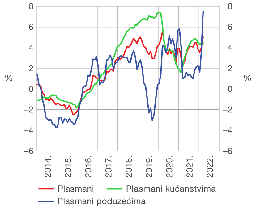 Ukupni plasmani monetarnih institucija domaćim sektorima (osim središnje države) bilježe značajan rast u ožujku ponajprije zbog rasta plasmana nefinancijskim poduzećima i, manje izraženo, rasta plasmana stanovništvu. Kao posljedica toga, plasmani poduzećima znatno su ubrzali rast na godišnjoj razini.