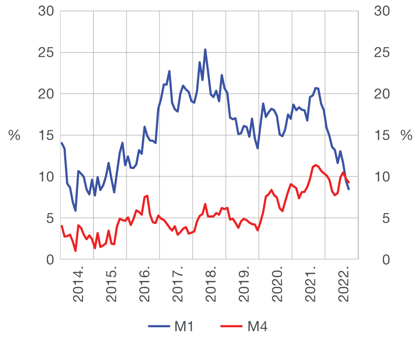 Ukupna likvidna sredstva (M4[1]) smanjila su se tijekom rujna za 2,2 mlrd. kuna ili 0,5% (Tablica 1.) kao odraz smanjenja neto inozemne aktive (NIA) kreditnih institucija, dok je neto domaća aktiva (NDA) blago porasla (na osnovi transakcija). Novčana masa (M1[2]) smanjila se za 2,5 mlrd. kuna u odnosu na kolovoz zbog manje gotovog novca izvan kreditnih institucija. Uz uobičajeno smanjenje gotovog novca u rujnu po završetku glavne turističke sezone, približavanje uvođenja eura već nekoliko mjeseci pridonosi smanjivanju gotovog novca i povećavanju deviznih depozita. Rast deviznih depozita stanovništva i poduzeća bio je u rujnu malo izrazitiji od pada kunskih depozita domaćih sektora, pa se kvazinovac blago povećao u odnosu na kolovoz (Tablica 3.). Time se nastavila tendencija povećavanja deviznih depozita, koji znatno rastu i na godišnjoj razini, dok se godišnji porast sredstava na transakcijskim računima zadržava na nešto nižoj razini od vrhunaca iz prethodnih nekoliko godina, kada su se sredstva na štednim i oročenim računima smanjivala nauštrb transakcijskih računa. Stoga se i rast M1 na godišnjoj razini nastavio snažnije usporavati te je u rujnu dosegnuo 8,5% na osnovi transakcija, dok se rast M4 u rujnu samo blago usporio, na 9,3%, (Slika 1.).