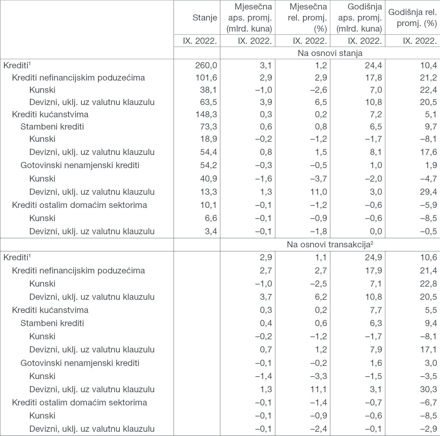 2 Transakcije prikazuju promjene iz kojih su isključeni učinci promjene tečaja, cjenovnih prilagodbi vrijednosnih papira, reklasifikacija te otpisa kredita, što uključuje i prodaje kredita u visini ispravka njihove vrijednosti.