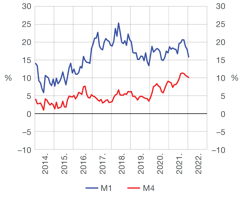 Ukupna likvidna sredstva (M4) i novčana masa (M1) smanjili su se u siječnju kao rezultat smanjenja neto inozemne aktive (NIA) monetarnog sustava, a plasmani su ostali gotovo nepromijenjeni. Stope rasta M4 i M1 na godišnjoj razini nadalje su vrlo visoke.