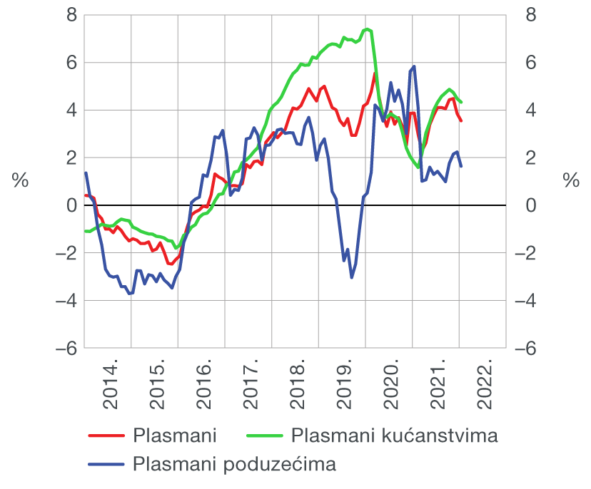 Ukupni plasmani monetarnih institucija domaćim sektorima (osim središnje države) ostali su gotovo nepromijenjeni u odnosu na mjesec ranije, a njihova se godišnja stopa rasta usporila s 3,9% u prosincu prethodne godine na 3,6% u siječnju ove godine (Slika 2.). U ukupnim plasmanima, koji su u siječnju iznosili 246,0 mlrd. kuna, najveći se dio odnosi na kredite (239,1 mlrd. kuna) koji su se zadržali na razini prethodnog mjeseca (Tablica 2.). Takva kretanja odraz su stagnacije kredita nefinancijskim poduzećima i stanovništvu, a povećanje kredita ostalim financijskim institucijama poništeno je smanjenjem kredita lokalnoj državi. Kod kreditiranja stanovništva, nastavio se rast gotovinskih nenamjenskih i stambenih kredita, ali su se u podjednakom iznosu smanjili krediti po kreditnim karticama uz jamstvo kartičarske kuće. Na godišnjoj razini, plasmani poduzećima usporili su svoj rast s 2,3% u prosincu na 1,6% u siječnju, a neznatno se usporio i rast plasmana stanovništvu (s 4,5% na 4,4%). Pritom se nastavilo usporavanje rasta stambenih kredita uoči pokretanja novoga kruga subvencioniranja (s 9,2% na 8,4%), dok se rast gotovinskih nenamjenskih kredita ubrzao (s 2,4% na 3,3%).