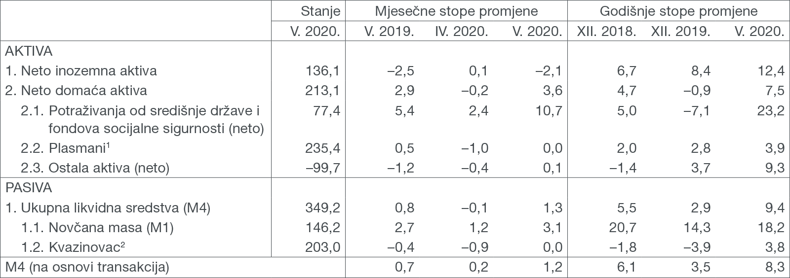 Ukupna likvidna sredstva (M4) iznosila su na kraju svibnja 349,2 mlrd. kuna ili za 4,5 mlrd. kuna (1,3%) više nego na kraju prethodnog mjeseca (Tablica 1.). Pritom je ostvareno podjednako nominalno povećanje novčane mase (M1) uz stagnaciju kvazinovca. Povećanju M4 pridonio je snažan rast neto domaće aktive (NDA), dok se neto inozemna aktiva (NIA) smanjila. Porast NDA-a bio je posljedica HNB-ova otkupa državnih vrijednosnih papira u nominalnom iznosu od 9,5 mlrd. kuna, što je povećalo neto potraživanja monetarnih institucija od središnje države. Promatra li se na godišnjoj razini, za M4 već je peti mjesec zaredom zabilježeno ubrzavanje rasta te je godišnja stopa rasta u svibnju dosegnula 8,3% (na osnovi transakcija). Godišnja stopa rasta novčane mase (M1) ubrzala se na 18,2% (Slika 1.), a kvazinovca na 2,1% zbog blažeg pada kunskih nemonetarnih depozita (na osnovi transakcija).
