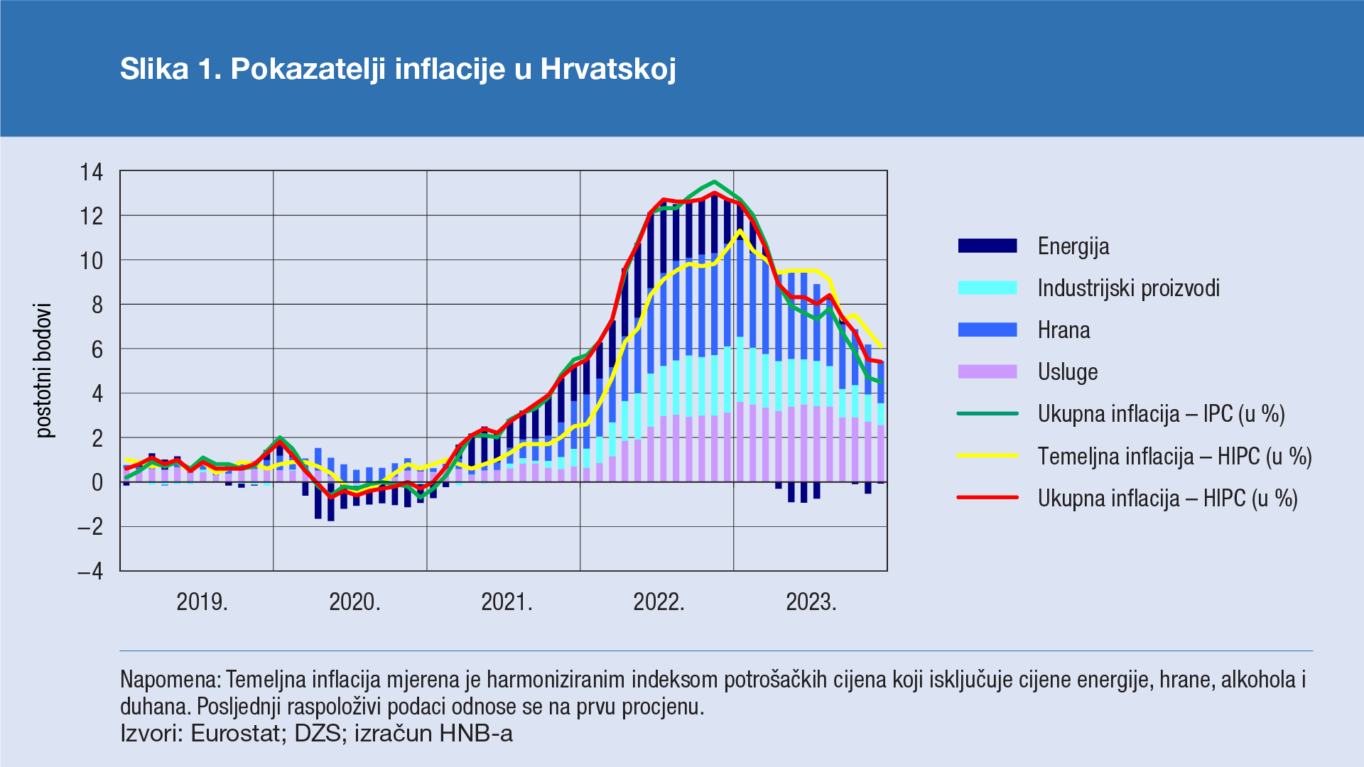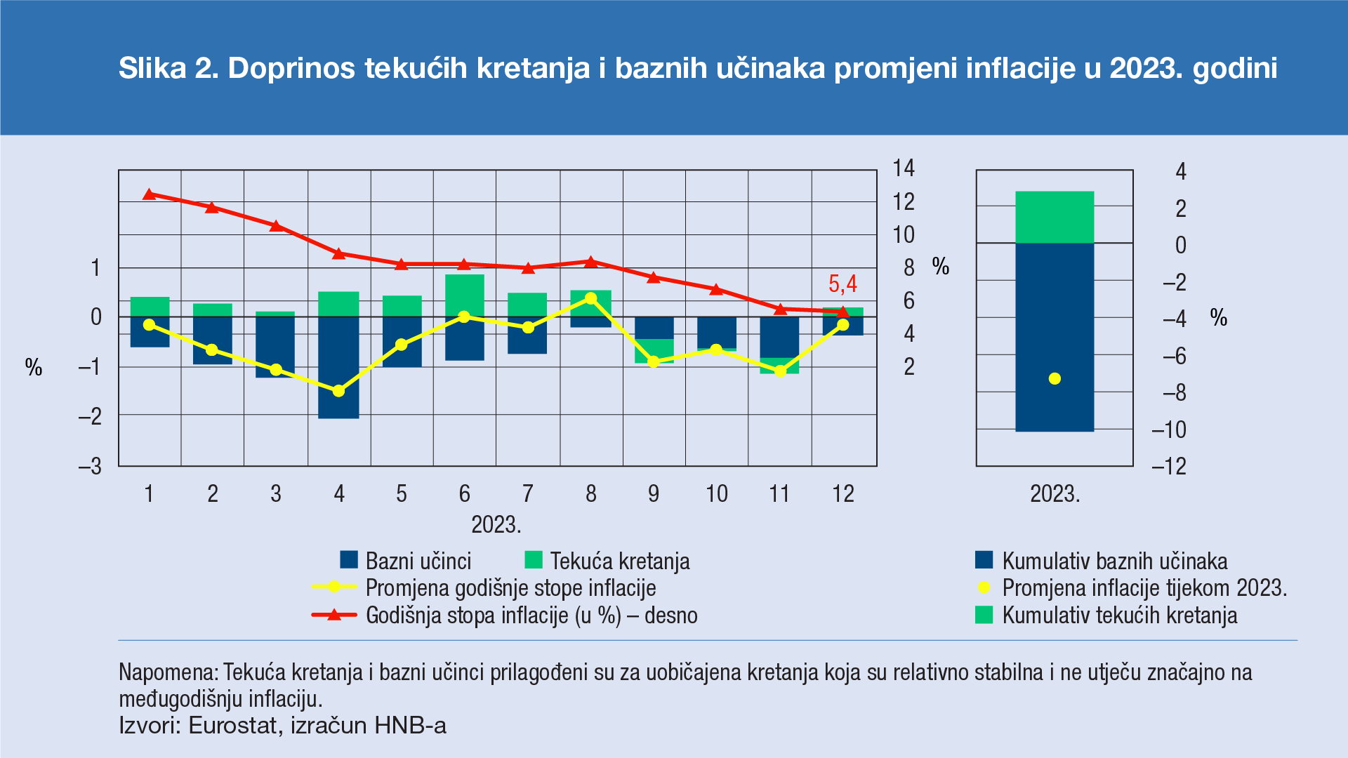 Prema prvoj procjeni Eurostata inflacija mjerena harmoniziranim indeksom potrošačkih cijena (HIPC-om) u prosincu se nastavila usporavati (na 5,4% s 5,5% u studenom). Tome su pridonijela smanjenja godišnjih stopa rasta cijena svih glavnih podkomponenata inflacije osim energije (Slika 1.). Smanjenje inflacije na godišnjoj razini odražava zamjetno popuštanje tekućih inflacijskih pritisaka u četvrtom tromjesečju ove godine uz povoljan učinak baznog razdoblja, odnosno prestanak djelovanja razmjerno visokih mjesečnih poskupljenja iz prosinca 2022. na međugodišnju stopu inflacije (Slika 2.). S druge strane, godišnja stopa inflacije energije primjetno se povećala zbog nepovoljnih baznih učinaka, odnosno znatno izraženijeg pojeftinjenja naftnih derivata u prosincu u odnosu na studeni koje je zabilježeno prošle u odnosu na ovu godinu. Godišnja stopa inflacije cijena energije tako se povećala s –4,1% u studenom na –0,5% u prosincu, dok su se primjetno smanjile inflacija cijena hrane (sa 7,7% u studenom na 6,5% u prosincu), industrijskih proizvoda (sa 4,6% na 3,7%) te usluga (s 8,6% na 8,1%). Smanjenje inflacije cijena industrijskih proizvoda i usluga ujedno se odrazilo i na primjetno usporavanje godišnje stope temeljne inflacije (koja ne uključuje cijene energije i hrane), sa 6,8% u studenom na 6,1% u prosincu. Ipak, ona je i dalje povišena, prije svega zbog još uvijek visoke inflacije cijena usluga, čemu su uvelike pridonijeli pritisci proizašli iz snažnog rasta plaća i solidne potražnje. Na razini cijele godine, prosječna godišnja inflacija mjerena HIPC-om usporila se sa 10,7% u 2022. na 8,4% u 2023. godini.