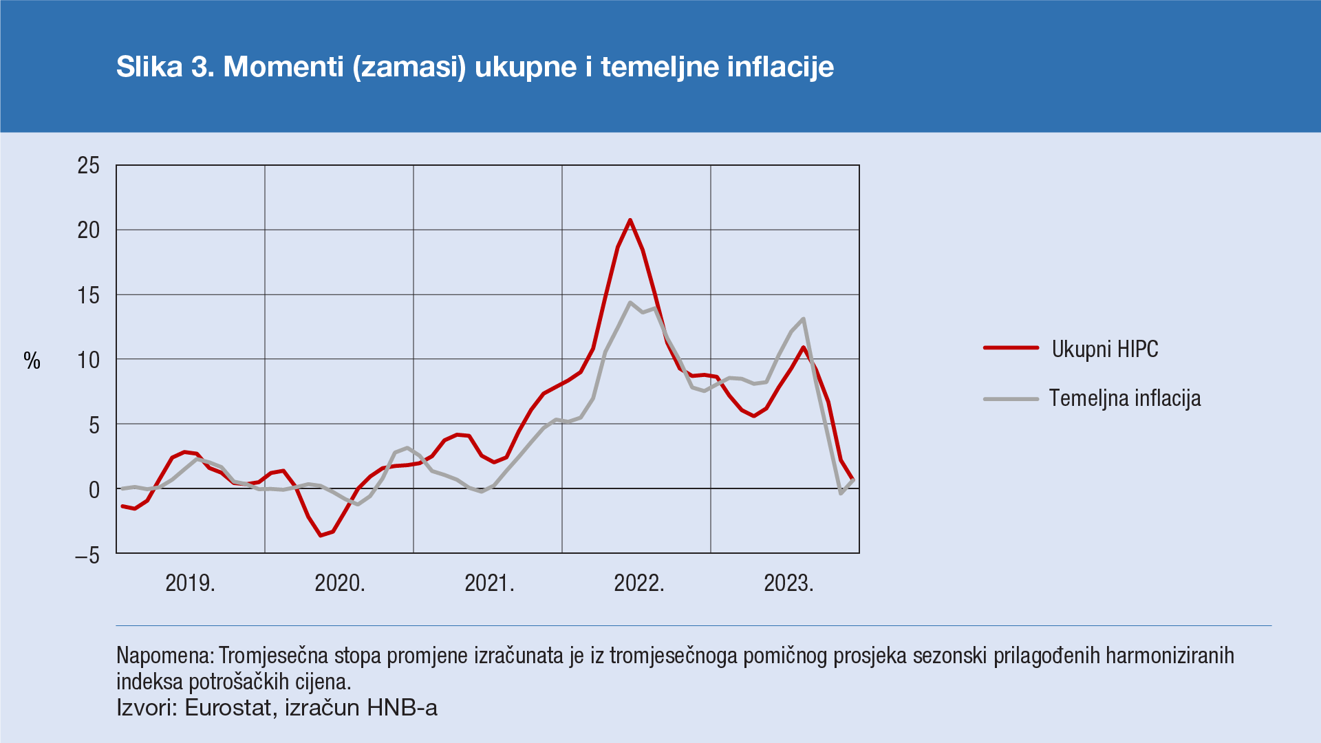 Zamah temeljne inflacije (tromjesečne stope promjene na godišnjoj razini) u prosincu se vrlo blago povećao, (Slika 3.), što odražava jačanje zamaha inflacije cijena industrijskih proizvoda i usluga (Slika 4.), no svi su navedeni zamasi i dalje na niskoj razini. Nasuprot tome, zamah inflacije cijena hrane i energije, kao i zamah ukupne inflacije u prosincu su se nastavili usporavati.