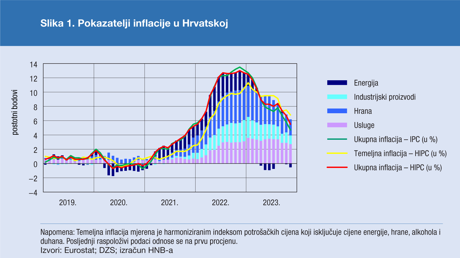 Prema prvoj procjeni Eurostata inflacija mjerena harmoniziranim indeksom potrošačkih cijena (HIPC-om) u studenom se znatno usporila (na 5,5% sa 6,7% u listopadu). Tome su pridonijele sve glavne komponente ukupne inflacije (Slika 1.). Smanjenje inflacije cijena energije u studenom na –4,1% s –0,7% u listopadu rezultat je smanjenja cijena energije (ponajviše naftnih derivata) u usporedbi s prethodnim mjesecom, kao i povoljnog učinka baznog razdoblja (zbog mjesečnog porasta tih cijena u studenom prošle godine kada su naftni derivati poskupjeli). Prosječna cijena sirove nafte tipa Brent na svjetskom tržištu u studenom je iznosila 83,7 USD te je bila za 8,1% niža u odnosu na listopad. Porast cijena sirove nafte na svjetskom tržištu nakon izbijanja sukoba na Bliskom istoku početkom listopada bio je kratkotrajan, a cijene sirove nafte su proteklih tjedana postupno padale. Međutim, moguće povećanje tih cijena zbog geopolitičkih napetosti i dalje predstavlja znatan rizik za kretanje inflacije u budućnosti. Inflacija cijena hrane (uključujući alkohol i duhan) u studenom se usporila na 7,7% s 8,6% u listopadu, u uvjetima smanjenih troškovnih pritisaka, usporavanja rasta proizvođačkih cijena hrane te povoljnog učinka baznog razdoblja (zbog izrazitijeg mjesečnog porasta cijena hrane u istom mjesecu prošle godine, koji više ne utječe na izračun godišnje stope inflacije cijena hrane).