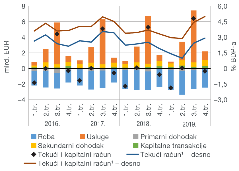 Smanjenju manjka na tekućem i kapitalnom računu u četvrtom tromjesečju 2019. najviše je pridonio veći neto izvoz usluga (za 0,3 mlrd. EUR), poglavito zahvaljujući prihodima od turizma, koji su porasli za 34,0%. Istodobno se manjak u robnoj razmjeni s inozemstvom povećao za 0,1 mlrd. EUR, pri čemu je rast robnog uvoza bio nešto brži od rasta izvoza (1,5% prema 1,0%). Ipak, zabilježeno pogoršanje salda u robnoj razmjeni bilo je primjetno slabijeg intenziteta nego u istom razdoblju prethodne godine, s obzirom na to da je usporavanje rasta robnog izvoza (s 2,2% godinu prije) bilo praćeno znatno izraženijim usporavanjem rasta uvoza (s 12,7% godinu prije).