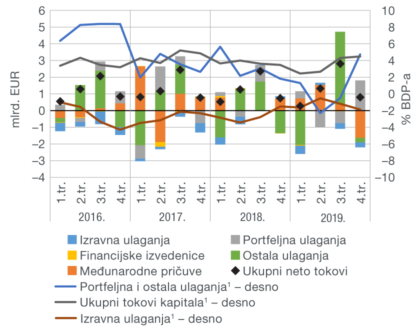 Na financijskom računu platne bilance u četvrtom je tromjesečju 2019. zabilježen neto priljev kapitala od 0,4 mlrd. EUR, u usporedbi s 0,5 mlrd. EUR ostvarenih u istom razdoblju prethodne godine. Promatrano po pojedinim računima, neto priljev kapitala zabilježen je na računima izravnih i ostalih ulaganja. S druge strane, neto odljev kapitala ostvaren na računu portfeljnih ulaganja poglavito je rezultat otplate dospjele inozemne obveznice države. Istovremeno su se bruto međunarodne pričuve smanjile.
