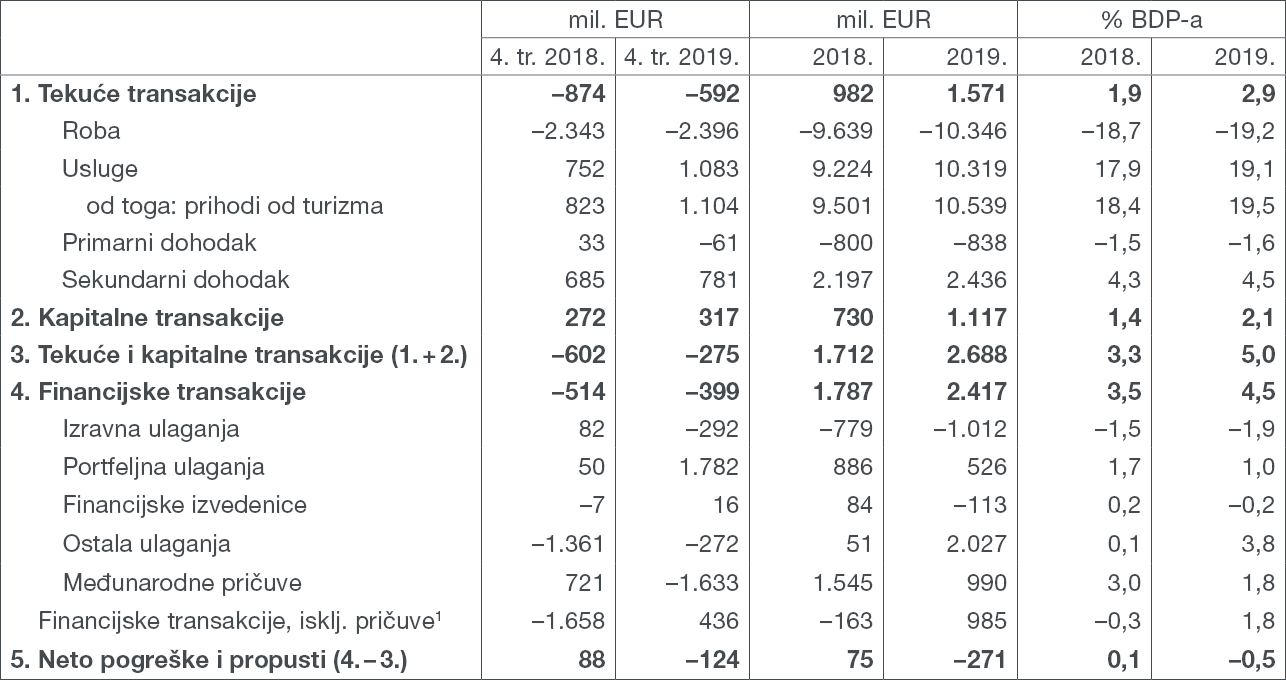 Na tekućem i kapitalnom računu platne bilance u posljednjem je tromjesečju 2019. ostvaren manjak od 0,3 mlrd. EUR, što je poboljšanje salda za 0,3 mlrd. EUR u usporedbi s istim razdobljem prethodne godine. Izrazito povoljna ostvarenja prije svega su rezultat rasta neto izvoza usluga, a u manjoj mjeri i poboljšanja salda na računima sekundarnog dohotka i kapitalnih transakcija. Nasuprot tome, pozitivna su kretanja ublažena pogoršanjem salda na računu primarnog dohotka i produbljivanjem manjka u robnoj razmjeni s inozemstvom.