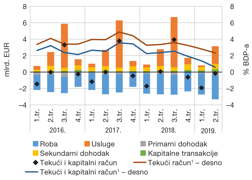 U drugom je tromjesečju 2019.[1] na tekućem i kapitalnom računu platne bilance ostvaren manjak od 0,2 mlrd. EUR, a u istom razdoblju prethodne godine zabilježen je višak od 0,1 mlrd. EUR. Pogoršanje salda poglavito je posljedica produbljivanja manjka u robnoj razmjeni s inozemstvom. Osim toga, povećao se manjak na računu primarnog dohotka. Nasuprot tome, nepovoljna su kretanja ublažena povećanjem viška na računima sekundarnog dohotka i kapitalnih transakcija te, u manjoj mjeri, povećanjem neto izvoza usluga. Promatraju li se posljednja četiri tromjesečja, višak na tekućem i kapitalnom računu platne bilance na kraju drugog tromjesečja 2019. iznosio je 2,3% BDP-a, što je za 0,9 postotnih bodova manje nego u cijeloj 2018. godini uglavnom zbog pogoršanja salda u međunarodnoj razmjeni robe.
