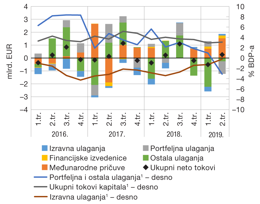 Na financijskom računu platne bilance u drugom je tromjesečju 2019. zabilježen neto odljev kapitala od 0,7 mlrd. EUR, što je za 0,1 mlrd. EUR više nego u istom razdoblju prethodne godine. Neto odljev kapitala bio bi niži da domaći institucionalni ulagači nisu sudjelovali u upisu dijela lipanjskog izdanja inozemne dugoročne obveznice koja je izdana u iznosu od 1,5 mlrd. EUR te da osim toga nisu od stranih ulagača kupili određen iznos državnih obveznica na sekundarnom tržištu vrijednosnih papira. Transakcije domaćih institucionalnih ulagača pridonijele su tome da je ukupan neto priljev kapitala na računu portfeljnih ulaganja u drugom tromjesečju bio niži od ukupne vrijednosti nove obveznice i iznosio je 1 mlrd. EUR. Istodobno je devizna sredstva prikupljena izdanjem nove obveznice Ministarstvo financija dijelom prodalo HNB-u, a dijelom deponiralo kod HNB-a radi refinanciranja dolarskih obveznica koje dospijevaju na naplatu u studenome, što je povećalo bruto međunarodne pričuve (za 1,5 mlrd. EUR). Blagi neto odljev kapitala (od 0,1 mlrd. EUR) zabilježen je i na računu inozemnih izravnih ulaganja s obzirom na to da je rast imovine (uglavnom na osnovi zadržane dobiti inozemnih poduzeća u vlasništvu rezidenata) bio praćen blagim smanjenjem obveza (prije svega dužničkih instrumenata). Istodobno je na računu ostalih ulaganja ostvaren neto priljev kapitala (od 0,3 mlrd. EUR) zbog smanjenja inozemne imovine i rasta obveza, ponajprije ostalih domaćih sektora.