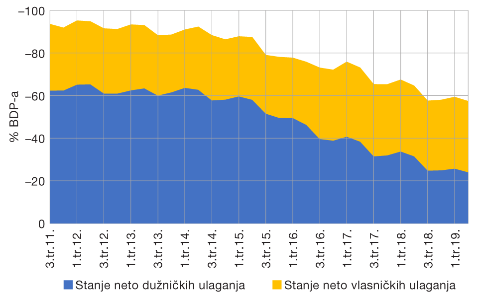 Napomena: Stanje međunarodnih ulaganja jednako je razlici između inozemne imovine i inozemnih obveza domaćih sektora. U neto dužnička ulaganja uključene su i financijske izvedenice.