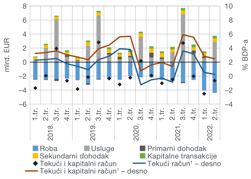 Na tekućem i kapitalnom računu platne bilance u drugom je tromjesečju 2022. ostvaren manjak od 0,6 mlrd. EUR, što je za 0,2 mlrd. EUR nepovoljnije nego u istom razdoblju prethodne godine. To je rezultat daljnjeg pogoršavanja salda robne razmjene s inozemstvom, što se znatnim dijelom odnosi na snažniji neto uvoz energenata koji djelomice odražava porast njihovih cijena. Promatraju li se posljednja četiri tromjesečja, višak na tekućem i kapitalnom računu u razdoblju do kraja lipnja 2022. iznosio je 2,5% BDP-a ili za 3,1 postotni bod manje nego u cijeloj 2021. godini.