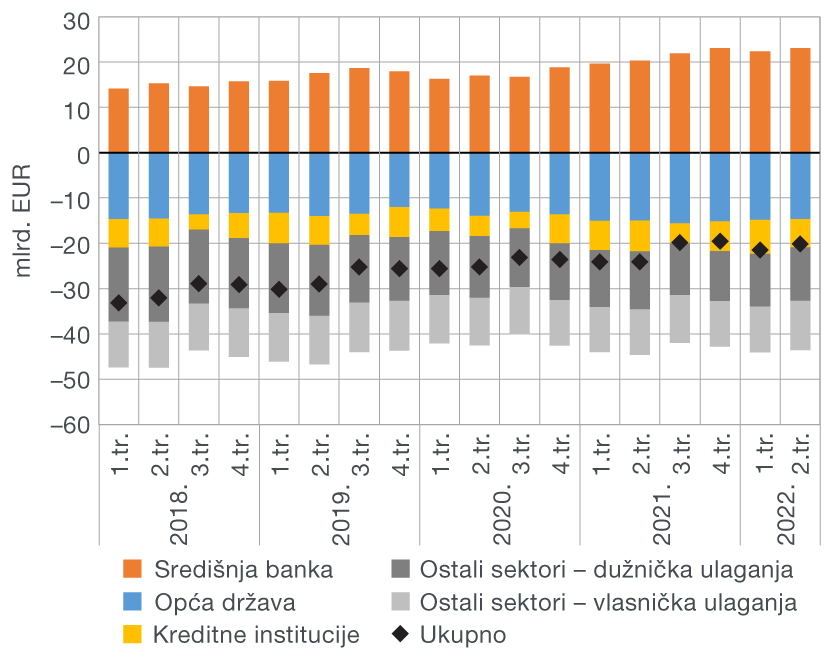 Smanjenje neto inozemnog duga rezultiralo je i poboljšanjem stanja neto međunarodnih ulaganja s –21,5 mlrd. EUR na kraju ožujka 2022. na –20,2 mlrd. EUR na kraju lipnja. Pritom se poboljšala neto inozemna pozicija svih domaćih sektora, a najviše središnje banke i kreditnih institucija (Slika 3.a). U skladu s tim relativni se pokazatelj stanja neto međunarodnih ulaganja poboljšao na –32,8% BDP-a na kraju lipnja, s –36,4% BDP-a koliko je iznosio na kraju ožujka 2022. godine (Slika 3.b).