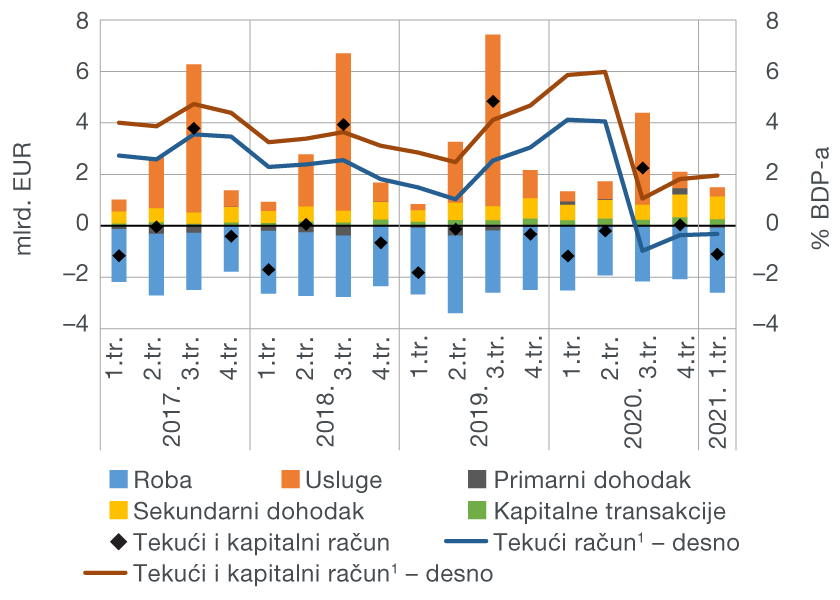 U prvom je tromjesečju 2021. na tekućem i kapitalnom računu platne bilance ostvaren manjak od 1,1 mlrd. EUR, što je blago poboljšanje salda u odnosu na isto razdoblje prethodne godine (Slika 1.a). To je poboljšanje isključivo rezultat rasta viška na računima sekundarnog dohotka i kapitalnih transakcija zbog primjetnog povećanja neto prihoda od transakcija s proračunom EU-a. Povoljna su kretanja korištenja sredstava iz proračuna EU-a, međutim, dobrim dijelom poništena izraženim pogoršanjem salda na računu primarnog dohotka te, u manjoj mjeri, smanjenjem neto izvoza usluga.