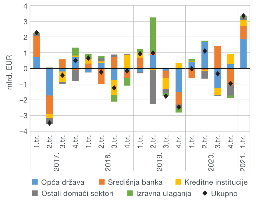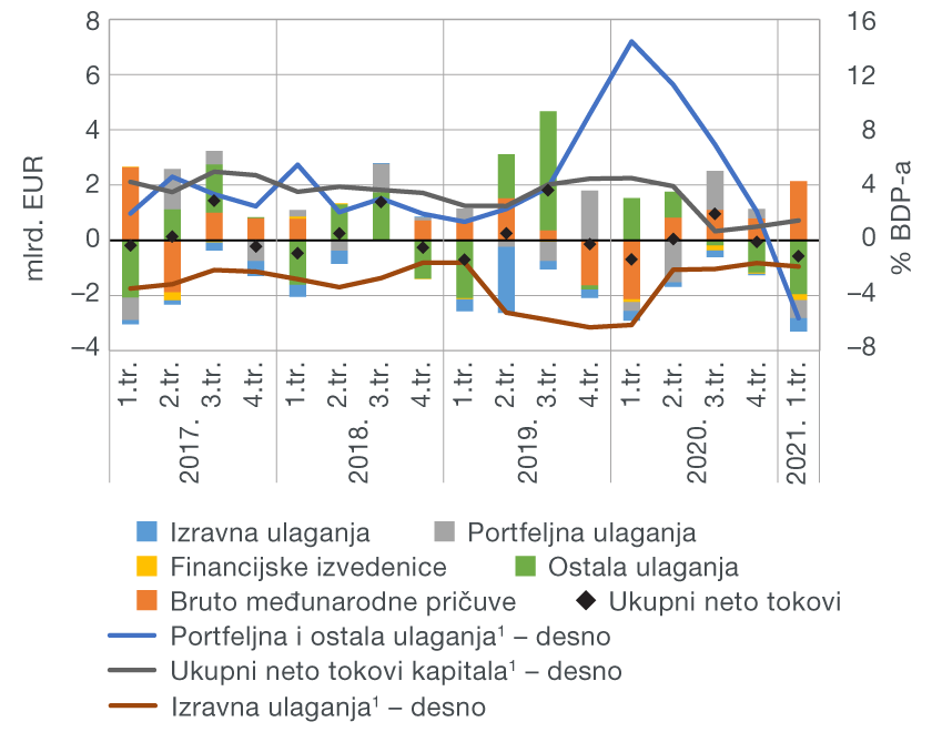 Na financijskom je računu platne bilance u prvom tromjesečju 2021. ostvaren neto priljev kapitala od 1,2 mlrd. EUR (Slika 1.b). Najveći je neto priljev kapitala zabilježen na osnovi ostalih ulaganja (2,0 mlrd. EUR), a u znatno manjoj mjeri i na osnovi portfeljnih (od 0,7 mlrd. EUR) te inozemnih izravnih ulaganja (0,5 mlrd. EUR), dok su se istodobno bruto međunarodne pričuve znatno povećale (za 2,1 mlrd. EUR).