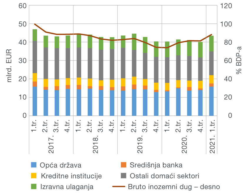 Stanje bruto inozemnog duga u prvom se tromjesečju 2021. povećalo za 3,3 mlrd. EUR (Slika 2.a) zbog rasta duga svih domaćih sektora. Pritom se najviše povećao dug opće države (za 1,9 mlrd. EUR) kao rezultat spomenutih zaduživanja na međunarodnom tržištu kapitala, putem SURE-a te kod IBRD-a, kao i transakcija na sekundarnom tržištu. Rast duga središnje banke (za 0,8 mlrd. EUR) isključivo je rezultat opisanog porasta obujma repo poslova. Kreditne su institucije također povećale svoj dug (za 0,4 mlrd. EUR), kao i ostali domaći sektori, uključujući obveze prema vlasnički povezanim vjerovnicima (za 0,3 mlrd. EUR), što se poglavito odnosi na privatna nefinancijska poduzeća. U skladu s tim, na kraju ožujka 2021. stanje bruto inozemnog duga iznosilo je 43,4 mlrd. EUR, odnosno 88,1% BDP-a, što je za 6,9 postotnih bodova više nego na kraju 2020. godine (Slika 2.b).