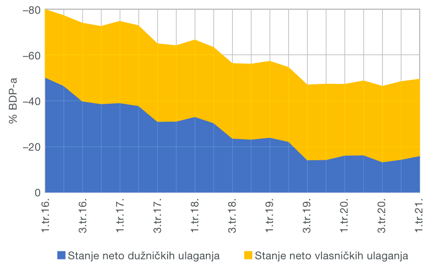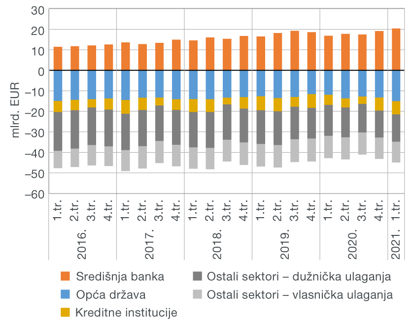 Rast neto inozemnog duga rezultirao je pogoršanjem stanja neto međunarodnih ulaganja s –24,1 mlrd. EUR na kraju 2020. na –24,6 mlrd. EUR na kraju ožujka 2021. godine. Pritom se najviše pogoršala neto inozemna pozicija države, što je ublaženo poboljšanjem pozicije središnje banke (Slika 3.a). Relativni pokazatelj stanja neto međunarodnih ulaganja pogoršao se s –48,8% BDP-a na kraju 2020. na –49,9% BDP-a na kraju ožujka 2021. (Slika 3.b). Kretanja na financijskom računu i posljedično pogoršanje stanja neto međunarodnih ulaganja uglavnom su odraz sezonskih kretanja karakterističnih za prvo tromjesečje.