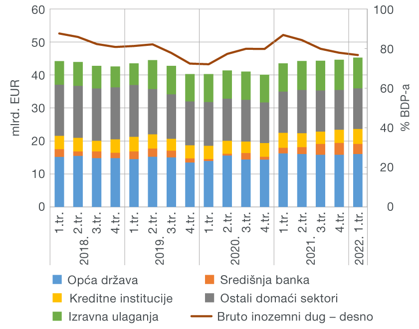 Na kraju ožujka 2022. stanje bruto inozemnog duga iznosilo je 45,2 mlrd. EUR, što je za 0,6 mlrd. EUR više nego na kraju prosinca prethodne godine (Slika 2.a). To je rezultat rasta duga svih domaćih sektora osim središnje banke, čije je stanje bruto inozemnog duga smanjeno (za 0,5 mlrd. EUR) zbog pada obujma repo poslova. S druge strane, svoj su bruto inozemni dug povećale kreditne institucije (za 0,6 mlrd. EUR), zatim ostali domaći sektori, uključujući obveze prema vlasnički povezanim vjerovnicima u inozemstvu (za 0,3 mlrd. EUR), te država (za 0,2 mlrd. EUR). Unatoč rastu duga u apsolutnom iznosu, snažan rast BDP-a u prvom tromjesečju rezultirao je poboljšanjem relativnog pokazatelja bruto inozemne zaduženosti za 1,2 postotna boda u odnosu na kraj 2021. te je na kraju ožujka 2022. iznosio 76,7% BDP-a (Slika 2.b).