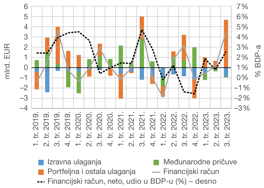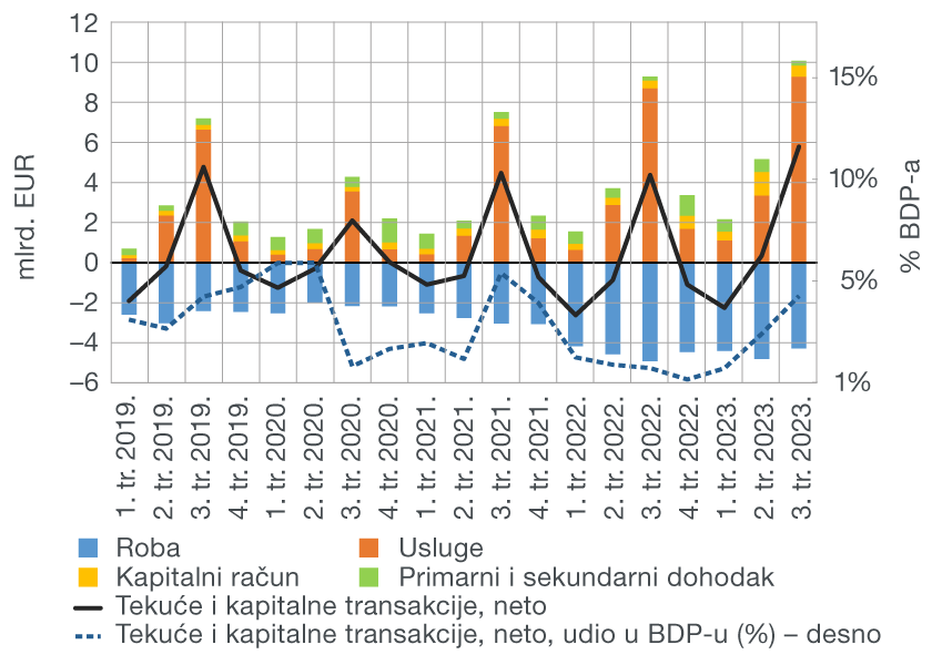 - Saldo tekućeg i kapitalnog računa platne bilance tijekom trećeg tromjesečja 2023. iznosio je 5,78 mlrd. EUR, što je zamjetno povećanje u odnosu na 4,37 mlrd. EUR iz istog tromjesečja prethodne godine.