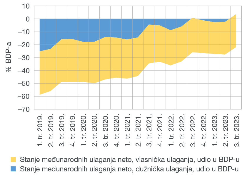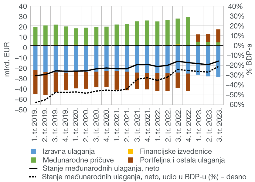Napomena: Stanje neto međunarodnih ulaganja jednako je razlici između inozemne imovine i inozemnih obveza domaćih sektora na kraju razdoblja. Negativna vrijednost stanja neto međunarodnih ulaganja pokazuje da su inozemne obveze hrvatskih rezidenata veće od njihove inozemne imovine. Obuhvaćeni su imovina i obveze na osnovi dužničkih instrumenata, vlasničkih ulaganja, financijskih izvedenica i ostalog.