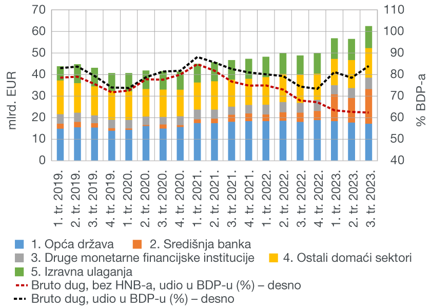 Stanje bruto inozemnog duga (Slika 5.) na kraju rujna 2023. iznosilo je 62,44 mlrd. EUR ili 83,9% BDP-a, što je za 5,95 mlrd. EUR ili za 5,5% postotnih bodova u BDP-u više nego na kraju lipnja 2023. Stanje inozemnog duga koji ne uključuje HNB poraslo je u odnosu na lipanj za 1,3 mlrd. EUR, tj. smanjilo se za 0,3 postotna boda ako promatramo udio duga u BDP-u. Utjecaj ostalih domaćih sektora na rast bruto inozemnog duga relativno je skroman.