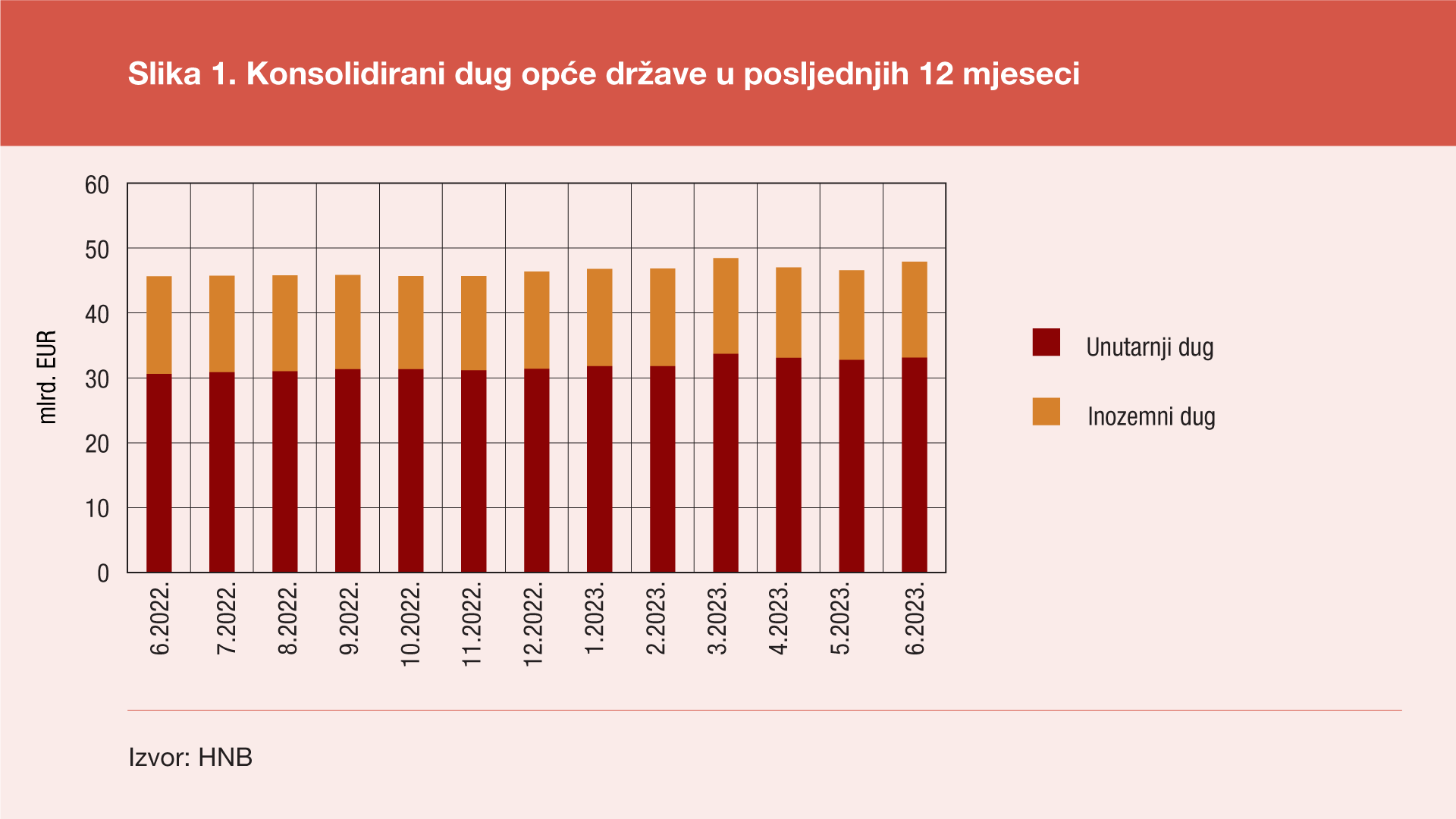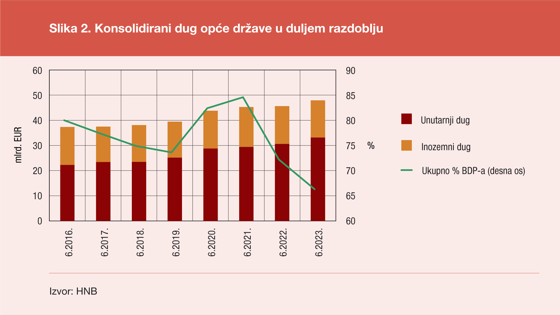Measured against the annual GDP[3], the total debt at the end of June 2023 amounted to 66.5% of GDP, which is a decrease of 5.9 percentage points on an annual basis from 72.4% of GDP at the end of June 2022 and a decrease of 2.6 percentage points from the end of the previous quarter, when this share stood at 69.1%.