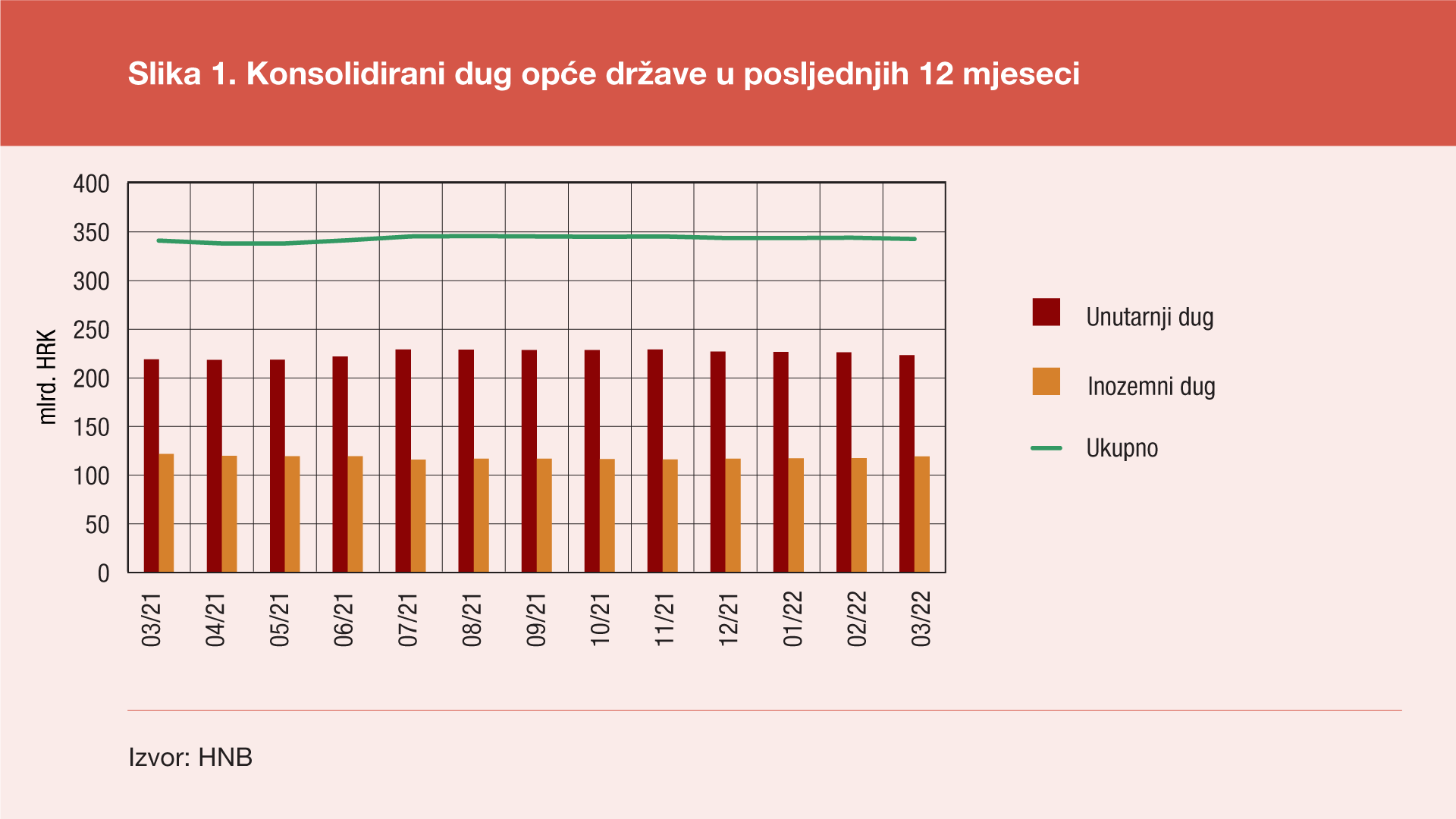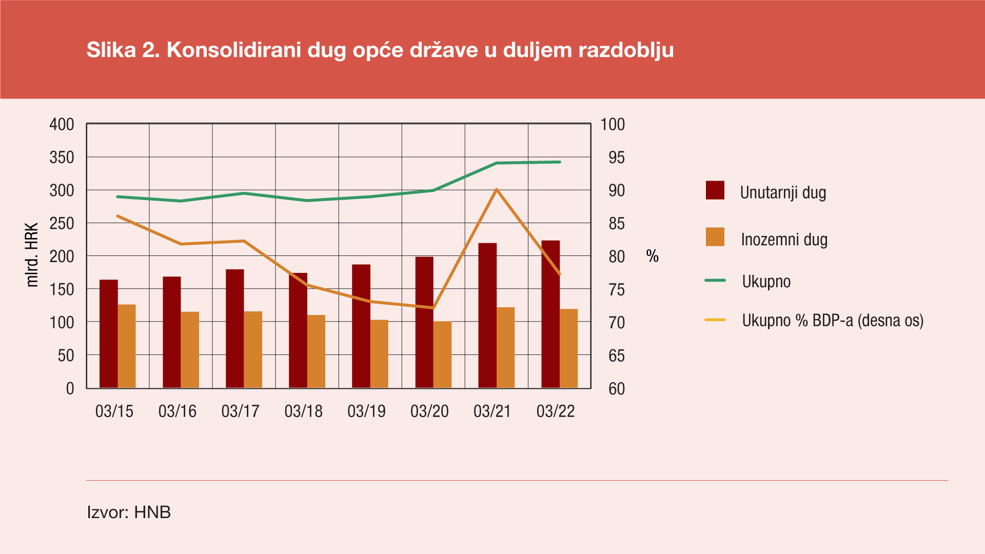 Prema konačnim podacima statistike državnih financija za prvo tromjesečje 2022. ukupno stanje konsolidiranog duga svih podsektora opće države[1] na kraju ožujka 2022. godine iznosilo je 342,5 milijardi kuna, pa je u odnosu na kraj prosinca 2021. ostvaren pad od 1,1 milijardu kuna (ili 0,3%), a u odnosu na kraj ožujka 2021. taj je dug veći za 1,6 milijardi kuna (ili 0,5%). Ovaj prirast duga na godišnjoj razini uzrokovan je porastom unutarnjeg duga za 4,1 milijardu kuna (ili 1,9%) te padom inozemnog duga za 2,5 milijardi kuna (ili 2,0%). U odnosu na kraj prethodnog tromjesečja unutarnji dug bilježi pad od 3,5 milijardi kuna (ili 1,6%), dok je inozemni dug porastao za 2,4 milijardi kuna (ili 2,1%).