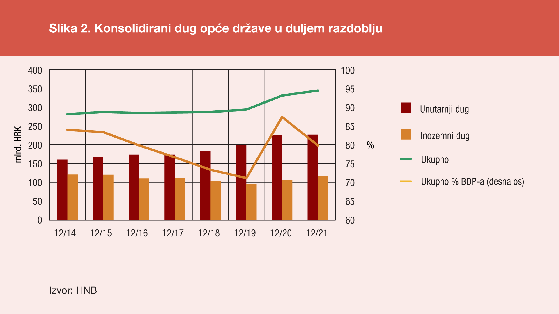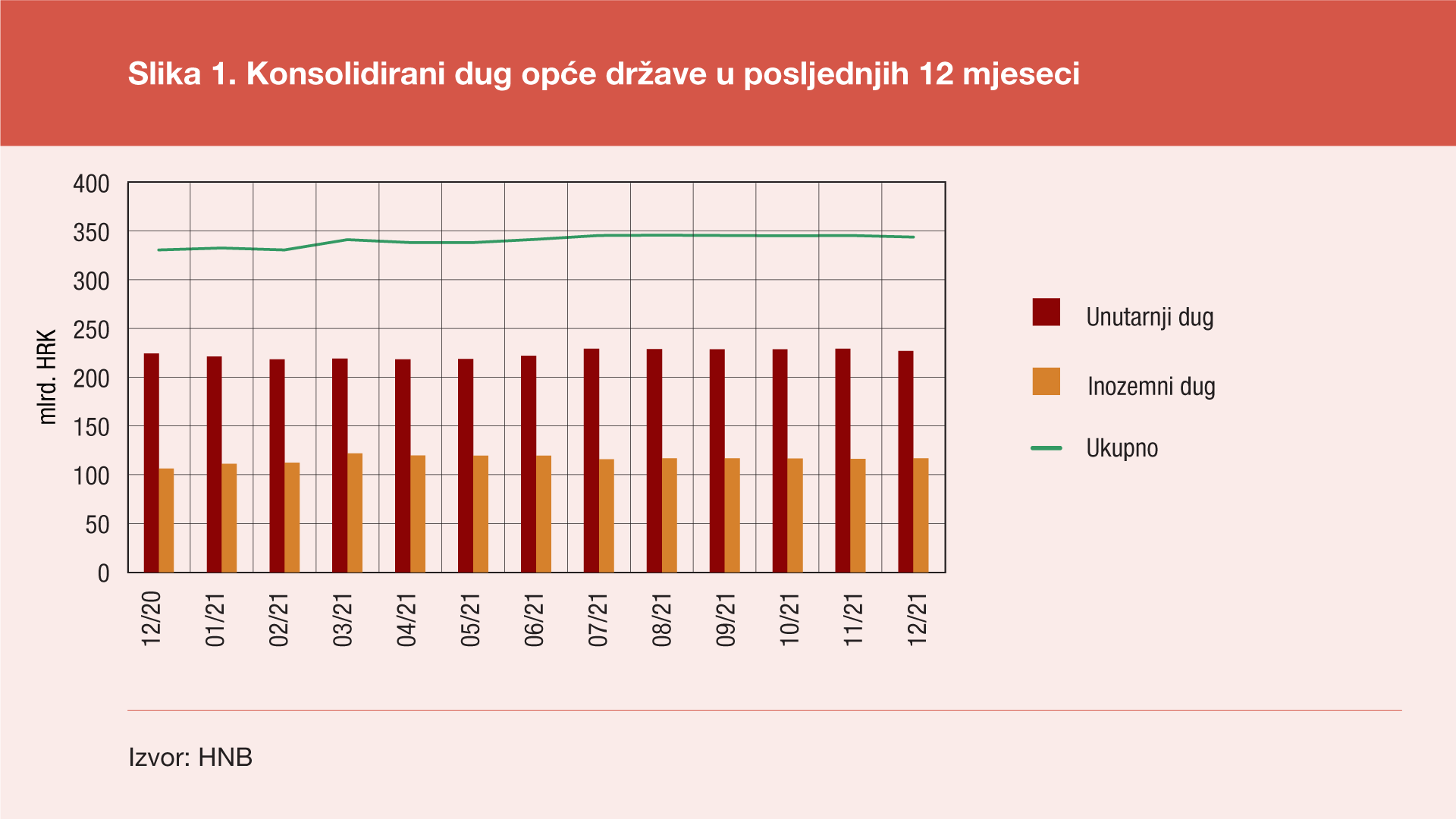 According to final data, the total consolidated debt of all general government sub-sectors[1] reached HRK 343.6bn at the end of December 2021, down HRK 1.7bn (or 0.5%) from the end of September 2021 and up by HRK 13.2bn (or 4%) from the end of December 2020. The annual debt growth was due to an increase in the domestic debt of HRK 2.5bn (or 1.1%) and in the external debt of HRK 10.7bn (or 10.1%). Domestic debt fell by HRK 1.7bn (or 0.7%), and external debt remained almost unchanged from the previous quarter.