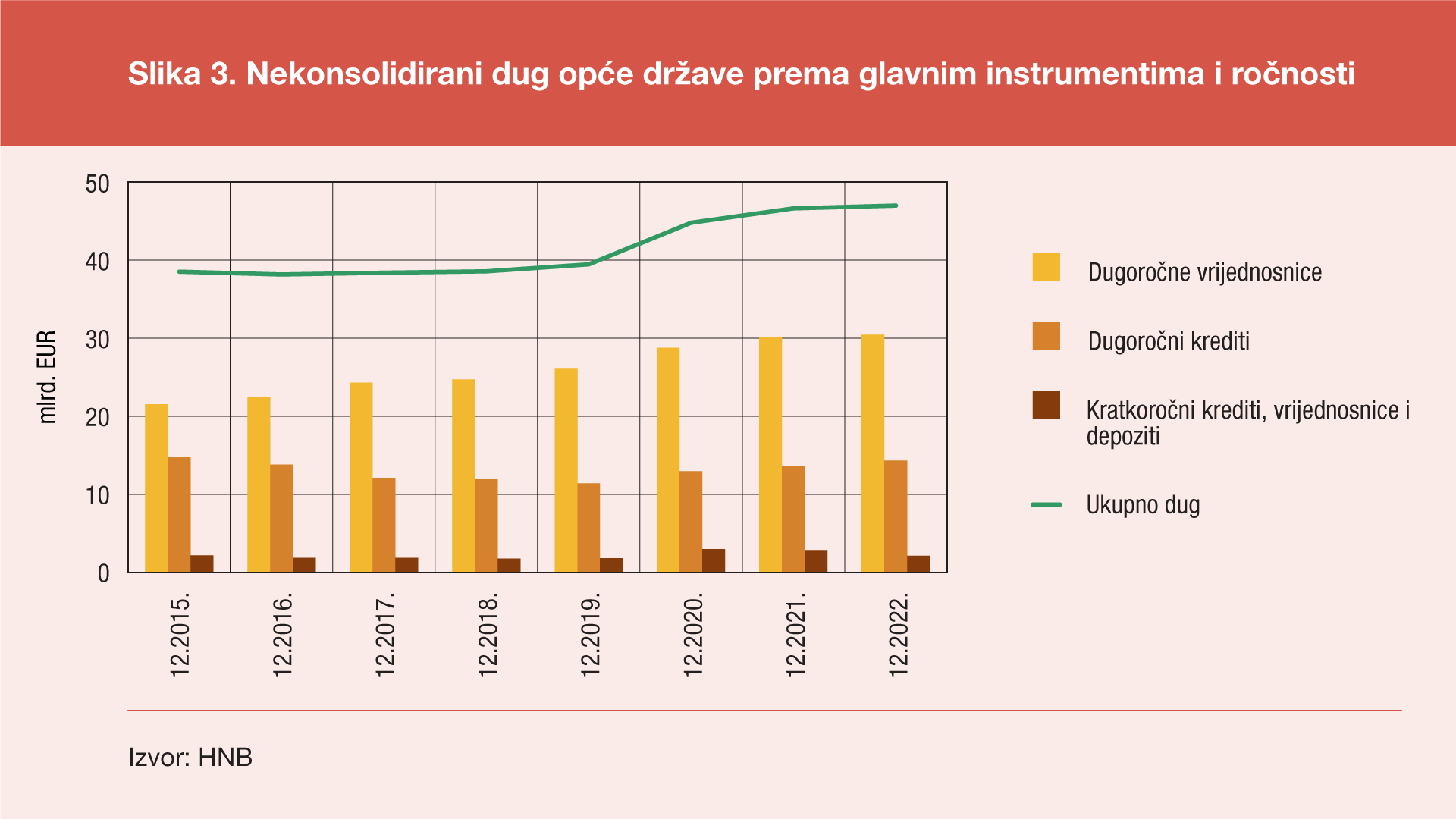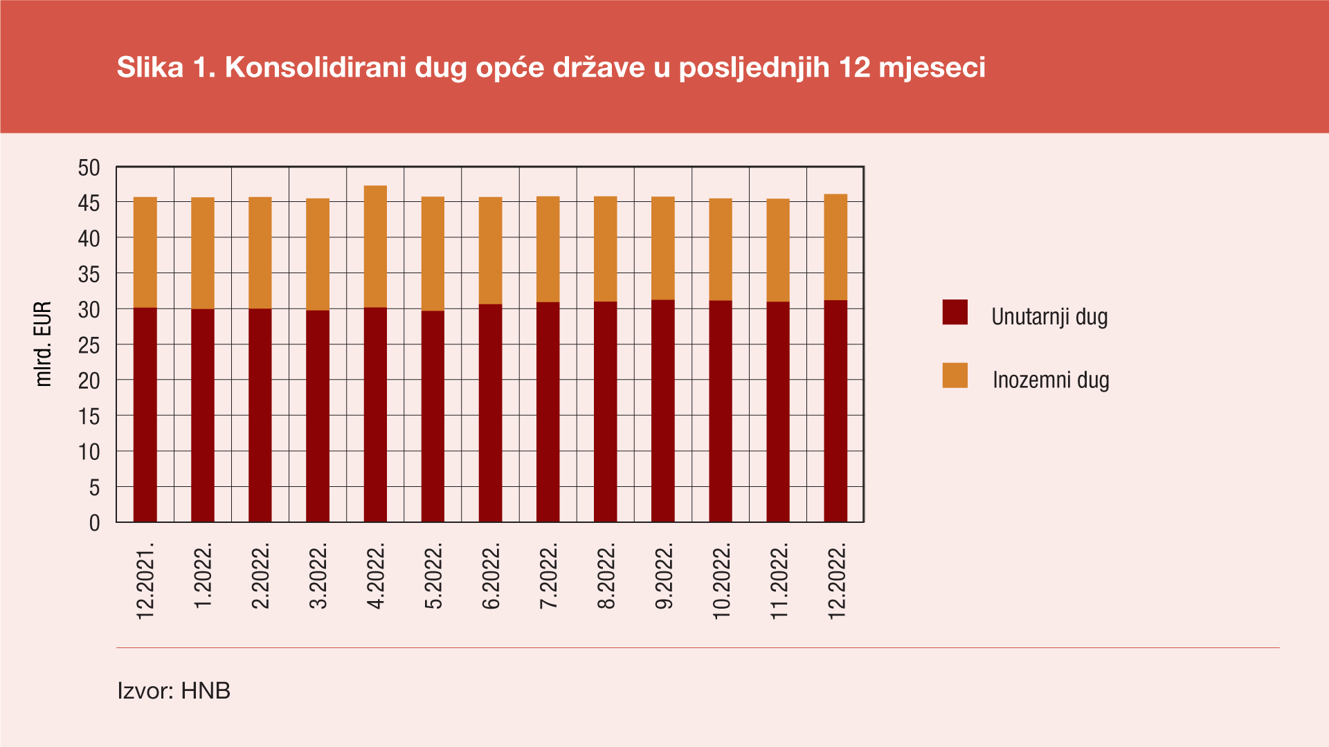 Prema konačnim[1] podacima statistike državnih financija za četvrto tromjesečje 2022. ukupno stanje konsolidiranog duga svih podsektora opće države na kraju prosinca 2022. godine iznosilo je 46,1 milijardu eura, pa je u odnosu na kraj rujna 2022. ostvaren rast od 0,4 milijarde eura (ili 0,9%), a u odnosu na kraj prosinca 2021. taj je dug veći za 0,5 milijardi eura (ili 1,0%). Taj rast duga na godišnjoj razini uzrokovan je kombinacijom pada inozemnog duga za 0,6 milijardi eura (ili 3,8%) i porasta unutarnjeg duga za 1,0 milijardi eura (ili 3,5%). U odnosu na kraj prethodnog tromjesečja unutarnji je dug pao za 0,1 milijardu eura (ili 0,3%), a inozemni dug porastao je za 0,5 milijardi eura (ili 3,4%).