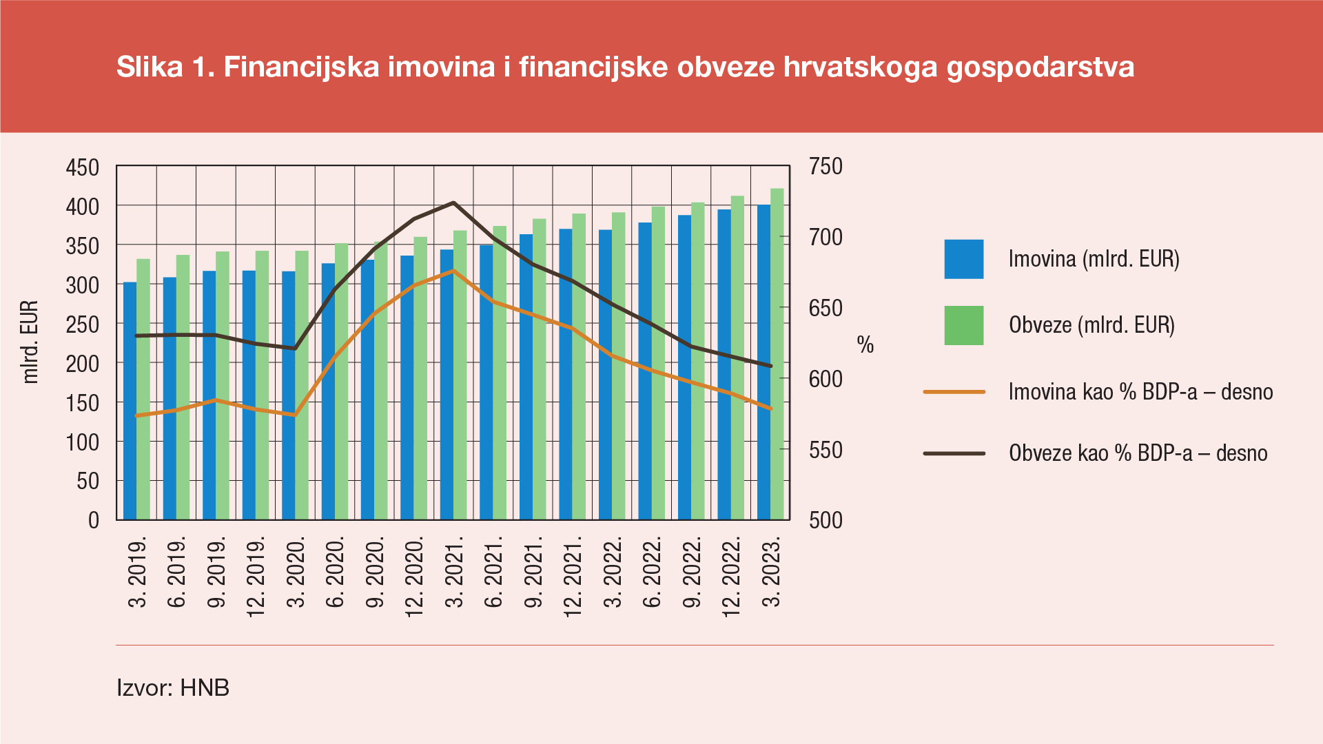 Na kraju prvog tromjesečja 2023.(Slika 1.) financijska imovina hrvatskoga gospodarstva iznosila je 401 mlrd. EUR, što je povećanje od 6,2 mlrd. EUR u tom tromjesečju i povećanje od 31,8 mlrd. EUR u razdoblju od godine dana. Istodobno, financijske obveze hrvatskoga gospodarstva iznosile su 422 mlrd. EUR, a povećale su se za 9,6 mlrd. EUR u tromjesečju odnosno za 30,7 mlrd. EUR u razdoblju od godine dana. U odnosu na BDP financijska imovina hrvatskoga gospodarstva na kraju prvog tromjesečja 2023. iznosila je 579% godišnjeg BDP-a, što je smanjenje od 10,7 postotnih bodova u tom tromjesečju i smanjenje od 37,3 postotna boda u razdoblju od godinu dana. Istodobno, financijske obveze hrvatskoga gospodarstva u odnosu na BDP smanjile su se za 6,8 postotnih bodova u tromjesečju i za 43,7 postotnih bodova u godinu dana, te su na kraju prvog tromjesečja 2023. dosegnule razinu od 609% godišnjeg BDP-a. Time se nastavilo smanjivanje stanja imovine i obveza hrvatskoga gospodarstva u odnosu na BDP, koje je započelo u drugom tromjesečju 2021. zahvaljujući sporijem rastu njihove vrijednosti u odnosu na evidentan rast tromjesečnog BDP-a.