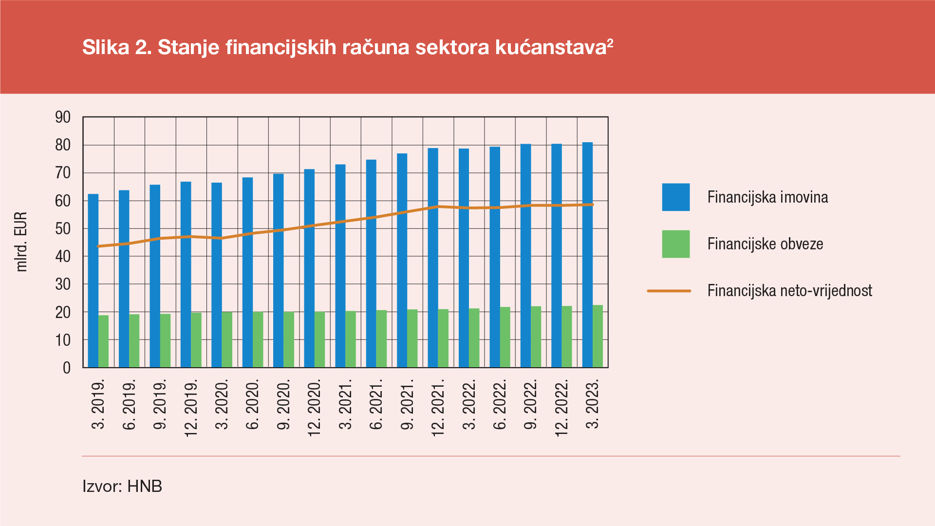 Na kraju prvog tromjesečja 2023. (Slika 2.) ukupna financijska imovina kućanstava iznosila je 81 mlrd. EUR ili 0,8% više nego na kraju prethodnog tromjesečja odnosno u razdoblju od godine dana financijska imovina kućanstava porasla je za 2,3 mlrd. EUR ili 3,0% u odnosu na kraj istog tromjesečja prethodne godine. Financijske obveze kućanstava povećale su se na 22 mlrd. EUR, što je porast od 1,4% u odnosu na kraj prethodnog tromjesečja, odnosno u razdoblju od godine dana financijske obveze kućanstava povećale su se za 1,2 mlrd. EUR ili 5,5% u odnosu na kraj istog tromjesečja prethodne godine. Ta kretanja rezultirala su povećanjem financijske netovrijednosti sektora kućanstava na 58 mlrd. EUR ili 0,5% više nego na kraju prethodnog tromjesečja (odnosno 1,2 mlrd. EUR ili 2,0% više u odnosu na kraj istog tromjesečja prethodne godine), te je tako netovrijednost tog sektora, koja pokazuje trend ubrzanog rasta od drugog tromjesečja 2020., ponovno blago porasla nakon smanjenja u prvom i četvrtom tromjesečju 2022. godine.