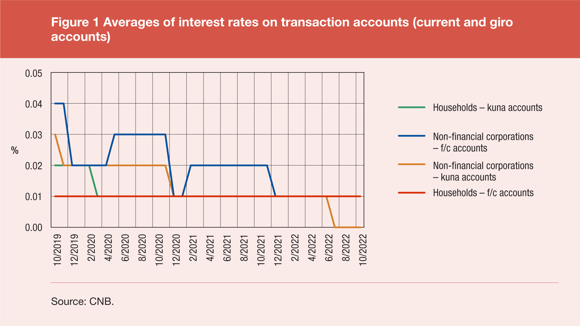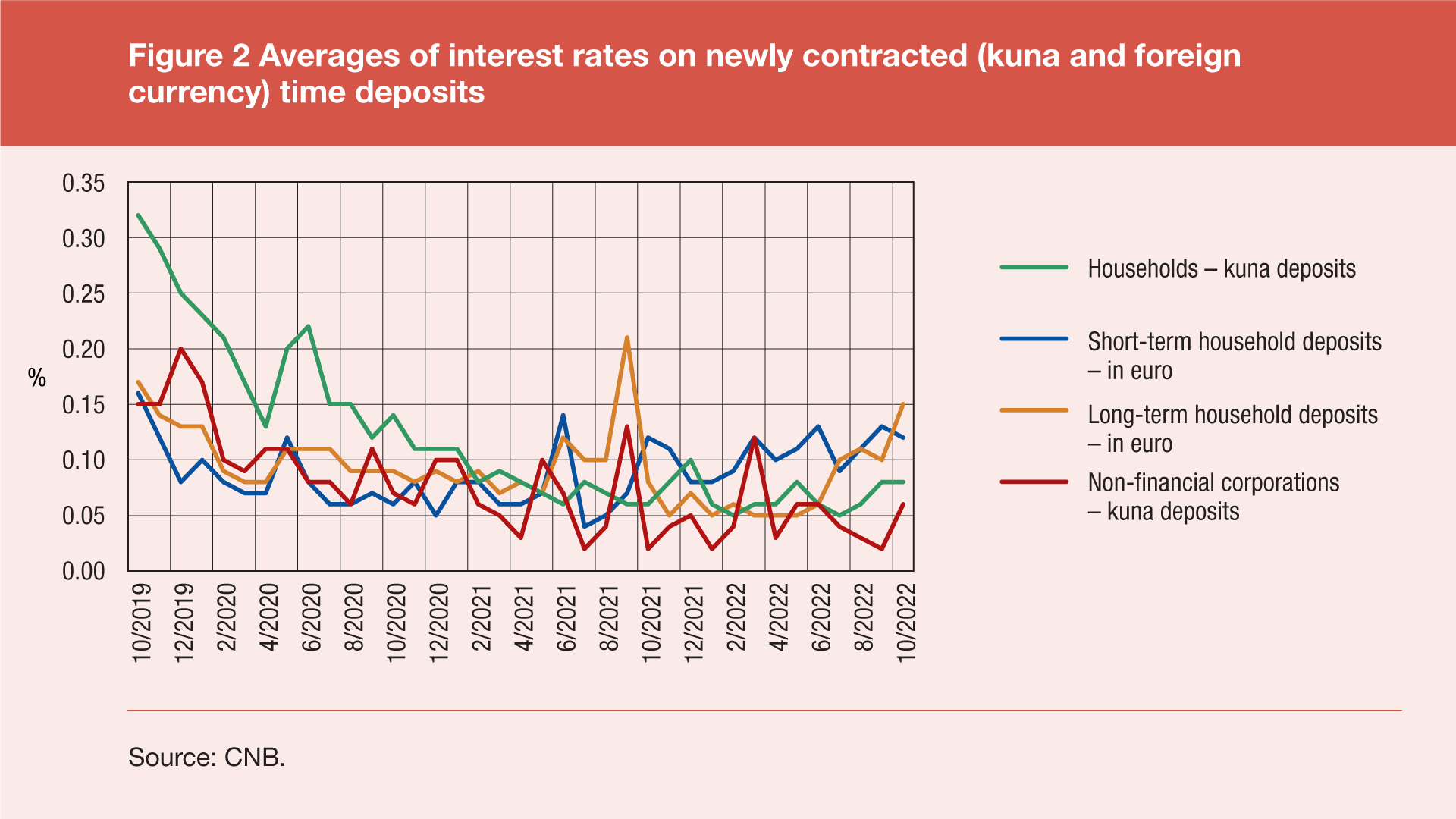 As regards transaction accounts (current and giro), the averages of interest rates on kuna and foreign currency accounts of households were at the same level in October 2022 as in October 2021 and stood at 0.01%. The averages of interest rates on kuna and foreign currency transaction accounts of non-financial corporations were 0.00% and 0.01% respectively, with both averages being 0.01 percentage point lower than in October 2021.