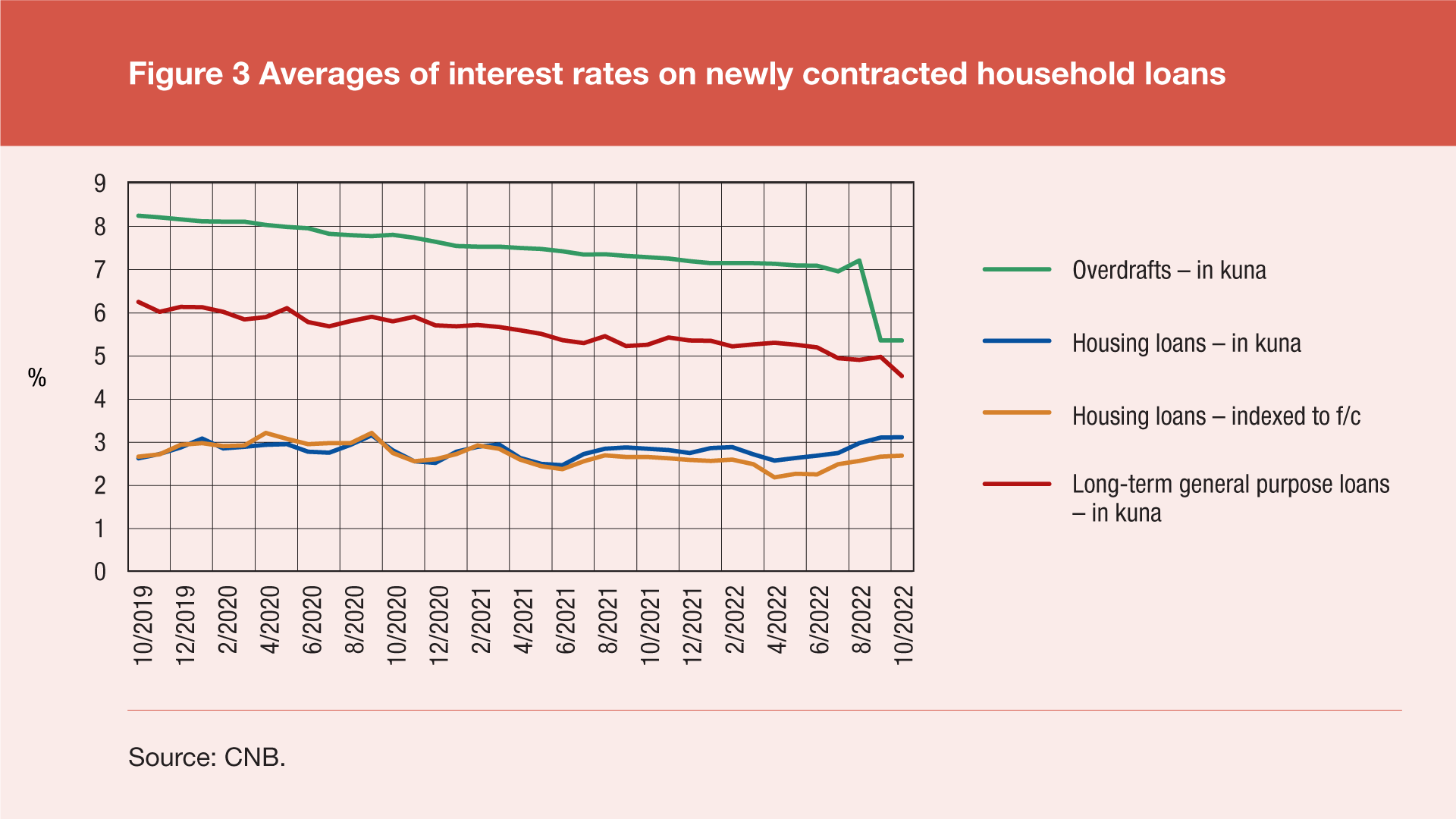 As for the main categories of household loans, the highest average of interest rates in October 2022 was recorded for kuna loans in the form of transaction account overdrafts. It fell significantly as early as in September 2022, and in October it was 5.36% (1.93 percentage points down from October 2021), following the beginning of the implementation of the Memorandum of Understanding in respect of current account overdrafts signed on 22 July 2022. The lowest average of interest rates was seen in housing loans indexed to foreign currency (2.69%, up by 0.03 percentage points from October 2021).