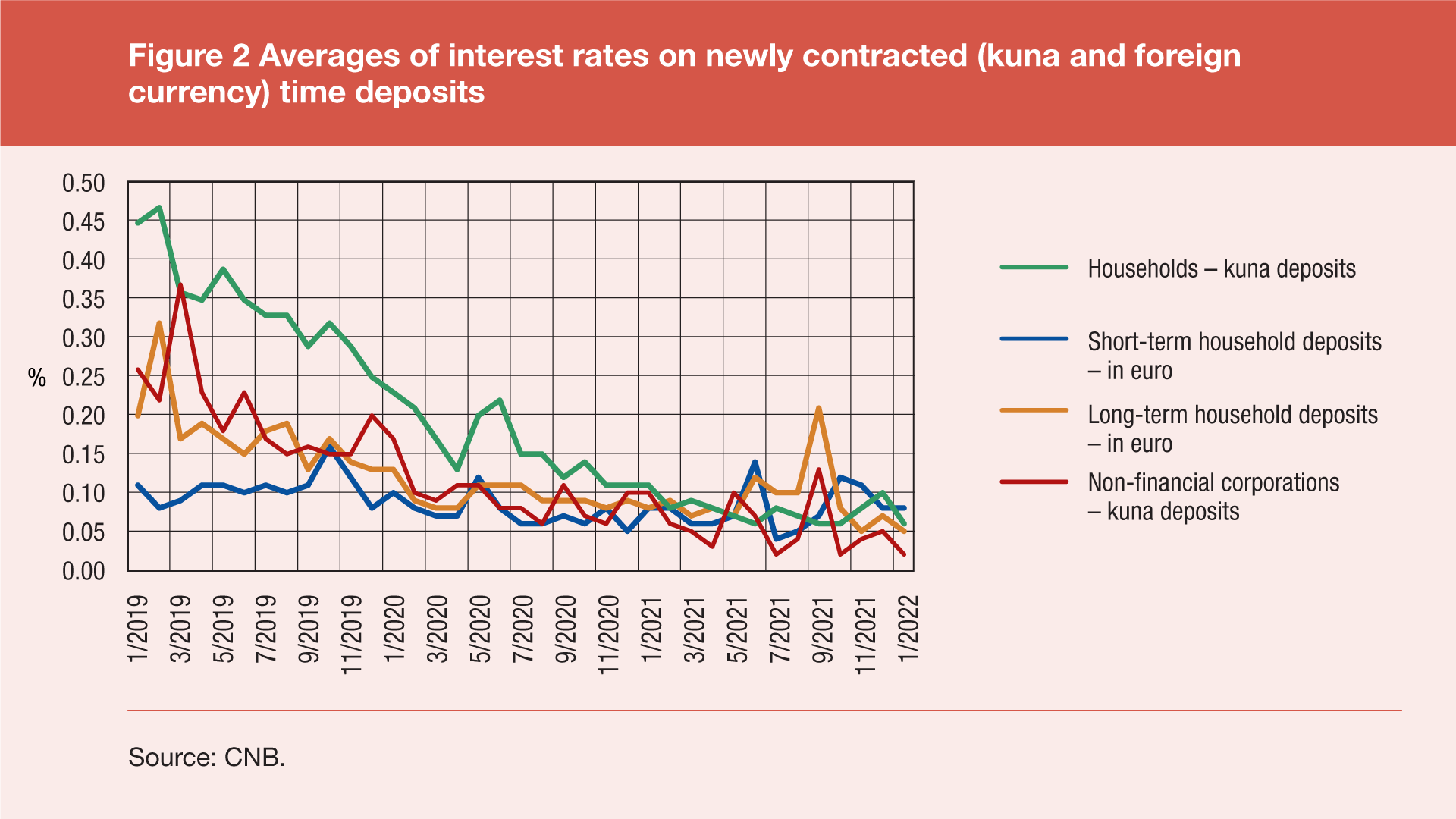 Kod oročenih depozita u siječnju 2022. prosjeci kamatnih stopa za kunske depozite bili su manji nego u istom mjesecu prethodne godine (za 0,05 postotnih bodova kod kućanstava i za 0,08 postotnih bodova kod nefinancijskih poduzeća), kao i prosjek kamatnih stopa za devizne depozite kućanstava u eurima za dugi rok (za 0,03 postotna boda), dok je prosjek kamatnih stopa za devizne depozite kućanstava za kratki rok ostao na istoj razini kao i u siječnju 2021. godine. U siječnju 2022. prosjek kamatnih stopa za oročene kunske depozite kućanstava iznosio je 0,06%, a za dugoročno oročene eurske depozite kućanstava 0,05%. Najniži je bio prosjek kamatnih stopa za oročene kunske depozite nefinancijskih poduzeća (0,02%).