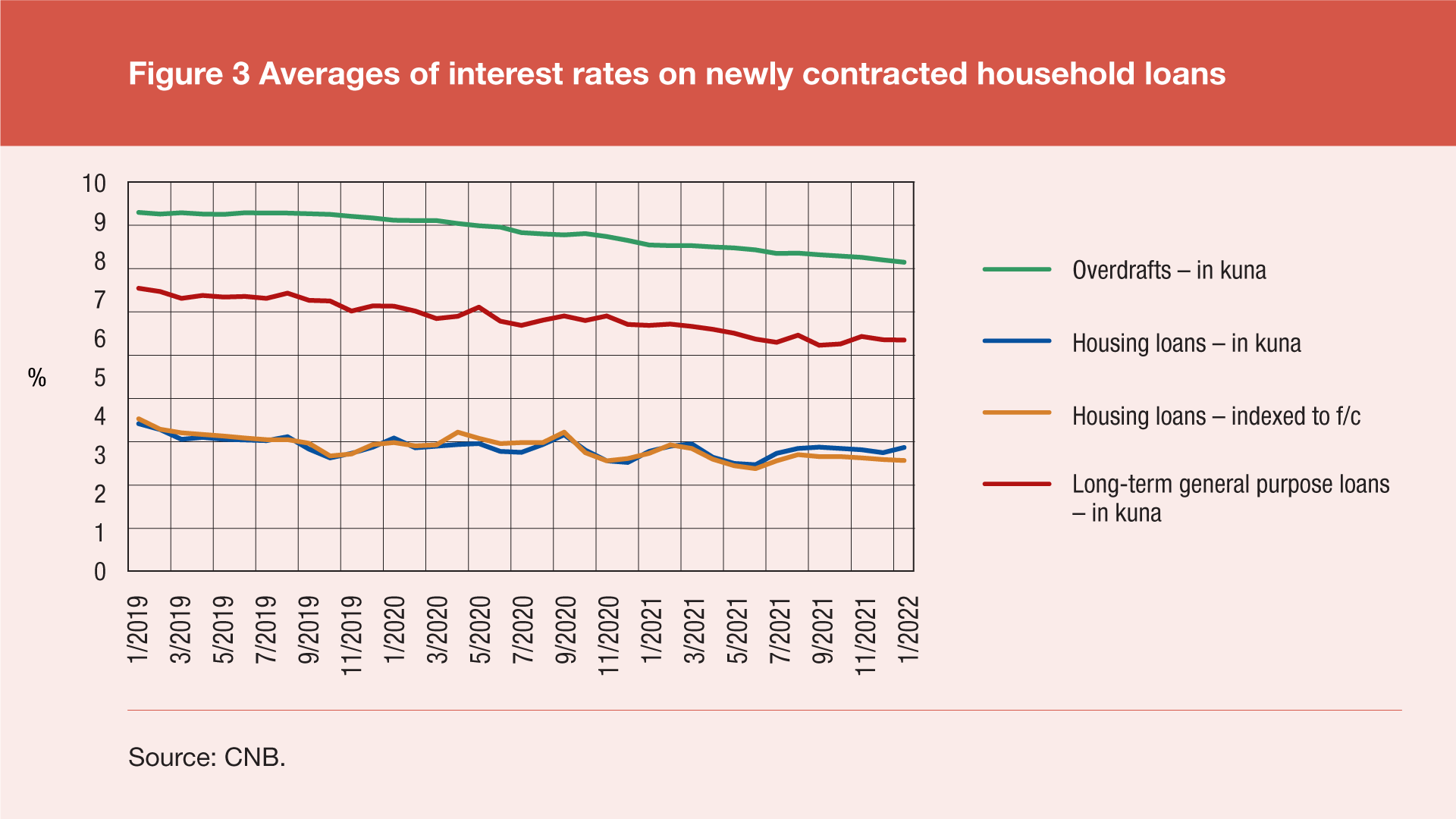 Kod glavnih kategorija kredita odobrenih kućanstvima, u siječnju 2022. najveći prosjek kamatnih stopa zabilježen je kod kunskih kredita na osnovi dopuštenih prekoračenja po transakcijskim računima (7,15%, što je za 0,4 postotna boda manje nego u siječnju 2021.), a najniži kod stambenih kredita odobrenih s valutnom klauzulom (2,57%, što je za 0,16 postotnih bodova manje nego u siječnju 2021.), pri čemu obje kategorije kredita imaju blagi trend pada i na tromjesečnoj i na godišnjoj razini.