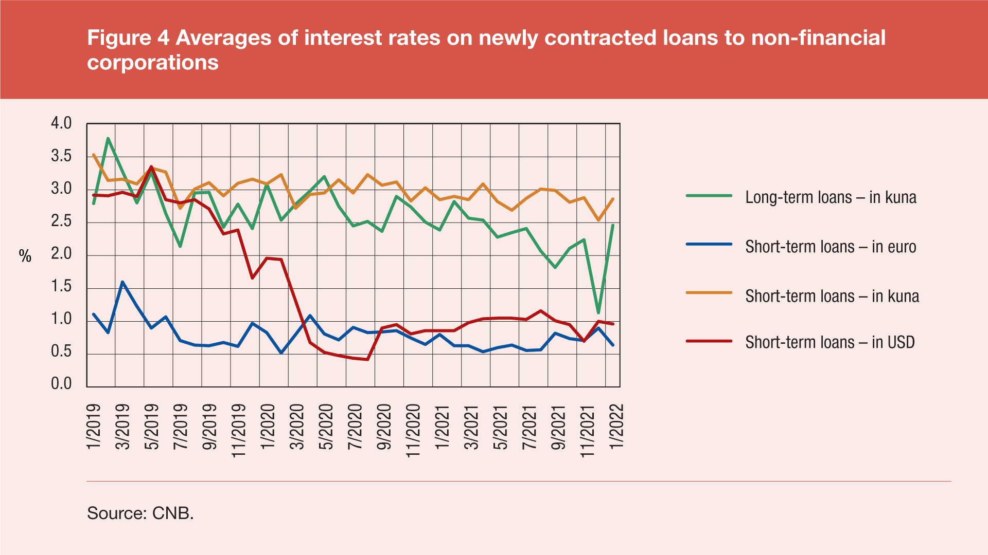 Kod glavnih kategorija kredita odobrenih nefinancijskim poduzećima, u siječnju 2022. najveći prosjek kamatnih stopa zabilježen je kod kratkoročnih kunskih kredita (2,86%, što je za 0,01 postotni bod više nego u siječnju 2021.), a najniži kod kratkoročnih eurskih kredita (0,64%, što je za 0,16 postotnih bodova manje nego u siječnju 2021. godine).