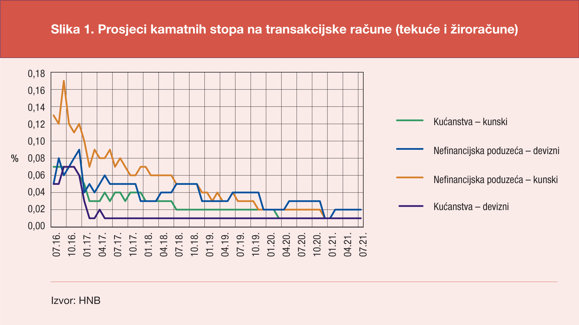Kod transakcijskih računa (tekućih i žiroračuna) u srpnju 2021. godine prosjek kamatnih stopa na kunske i devizne račune nefinancijskih poduzeća bio je za 0,01 postotni bod manji nego u istom mjesecu prethodne godine, dok su prosjeci kamatnih stopa na kunske i devizne račune kućanstava bili na istoj razini kao i u srpnju 2020. godine. Pritom je prosjek kamatnih stopa na devizne transakcijske račune nefinancijskih poduzeća iznosio 0,02%, a preostala tri prosjeka iznosila su 0,01% u srpnju 2021. godine.
